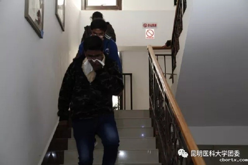 此次演练设想国际教育学院三楼厨房电源短路引起火灾。听到火警警报后,各楼层的学生代表在老师的指挥下明确分工,通过逐一敲门的方式告知留学生有火灾发生,并让他们用湿毛巾捂住口鼻,安排他们有序撤离。
