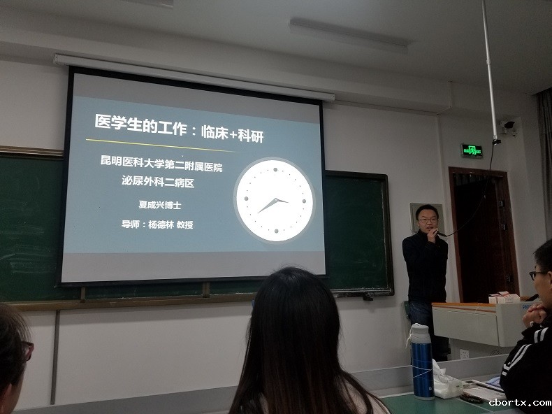 讲座邀请到第二临床医学院泌尿外科夏成兴、付什两位博士生现场讲授,他们详细分享了读博的生活和自己学医道路上的心得感受,并向大家介绍了一些实用的科研方法和技巧,比如查阅科研文献、设计科研课题,让两院医学生提前介入了解泌尿外科,为今后如何选择专业和规划人生提供了参考和借鉴。两位博士对同学们的提问一一耐心解答,现场气氛热烈。