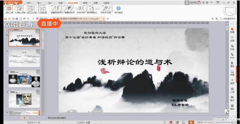 为保障辩论赛的顺利开展,我校邀请云南民族大学法学院博士欧阳若涛老师以“钉钉”线上培训的方式对各学院指导教师、参赛同学及团委社团部全体工作人员进行辩论赛培训,校团委副书记张培楠老师主持会议。以“浅析辩论的道与术”为主题,欧阳若涛老师分享了一些个人比赛经验,简要阐述了对辩论赛的基本认识。他将辩论六要点与四位辩手的分工结合讲解,强调不同辩手对各自辩论方向的把握,让同学们对高深的辩论体系有了明确的认知。欧阳若涛老师还与大家分享了具有辩论思维的意义和辩论的哲理价值。整个培训会深入浅出,举例生动,干货满满,将理论与实际相结合,使同学们受益匪浅