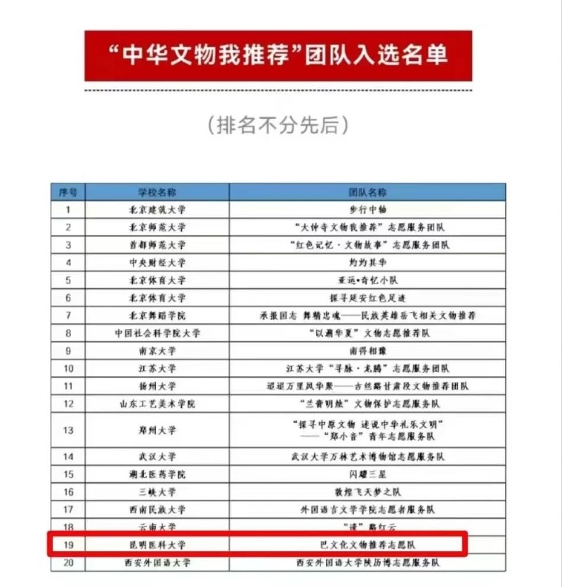 成功申报中国青年志愿者协会举办的2023年暑期“中华文物我推荐”志愿服务团队,团队成员赴四川达州巴文化文物起源地。发挥青年学子的优势,走近千年古文物,传承璀璨巴文化。志愿服务期间,得到达州市博物馆、图书馆、巴文化研究院、罗家坝遗址博物馆等专家们的支持,让同学们在讲好巴文化文物故事的同时,更加坚定文化自信。