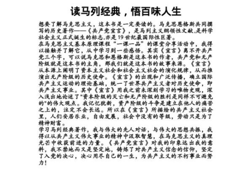 举办“读马列经典,悟百味人生”文章品读活动。马克思列宁主义经典著作蕴含着革命先辈们呕心沥血地为无产阶级和全人类求解放的不懈探索与光辉历程。品读经典活动,为同学们营造读经典、学理论、强素质、作表率的良好氛围。