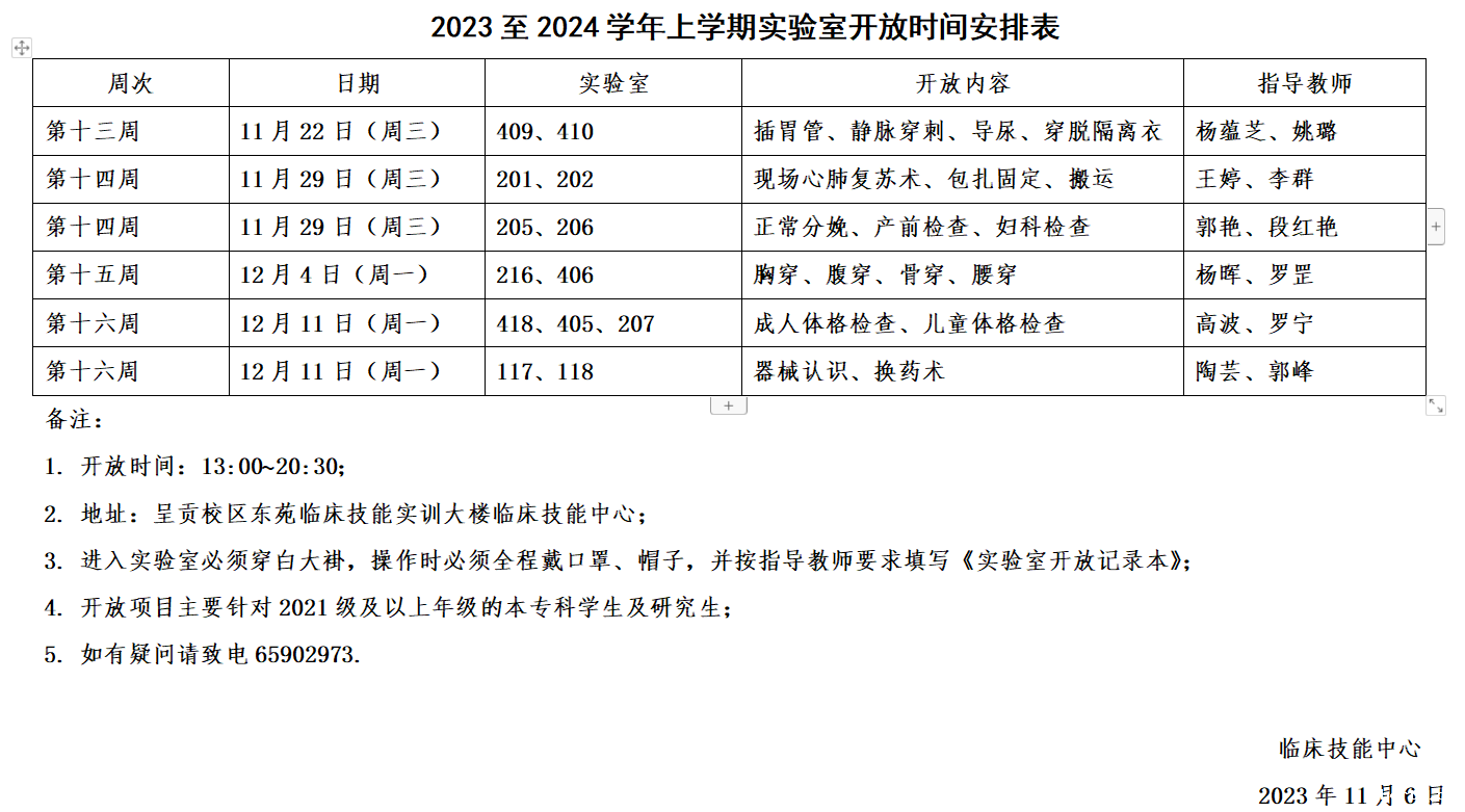 2023至2024学年下学期实验室开放时间安排表