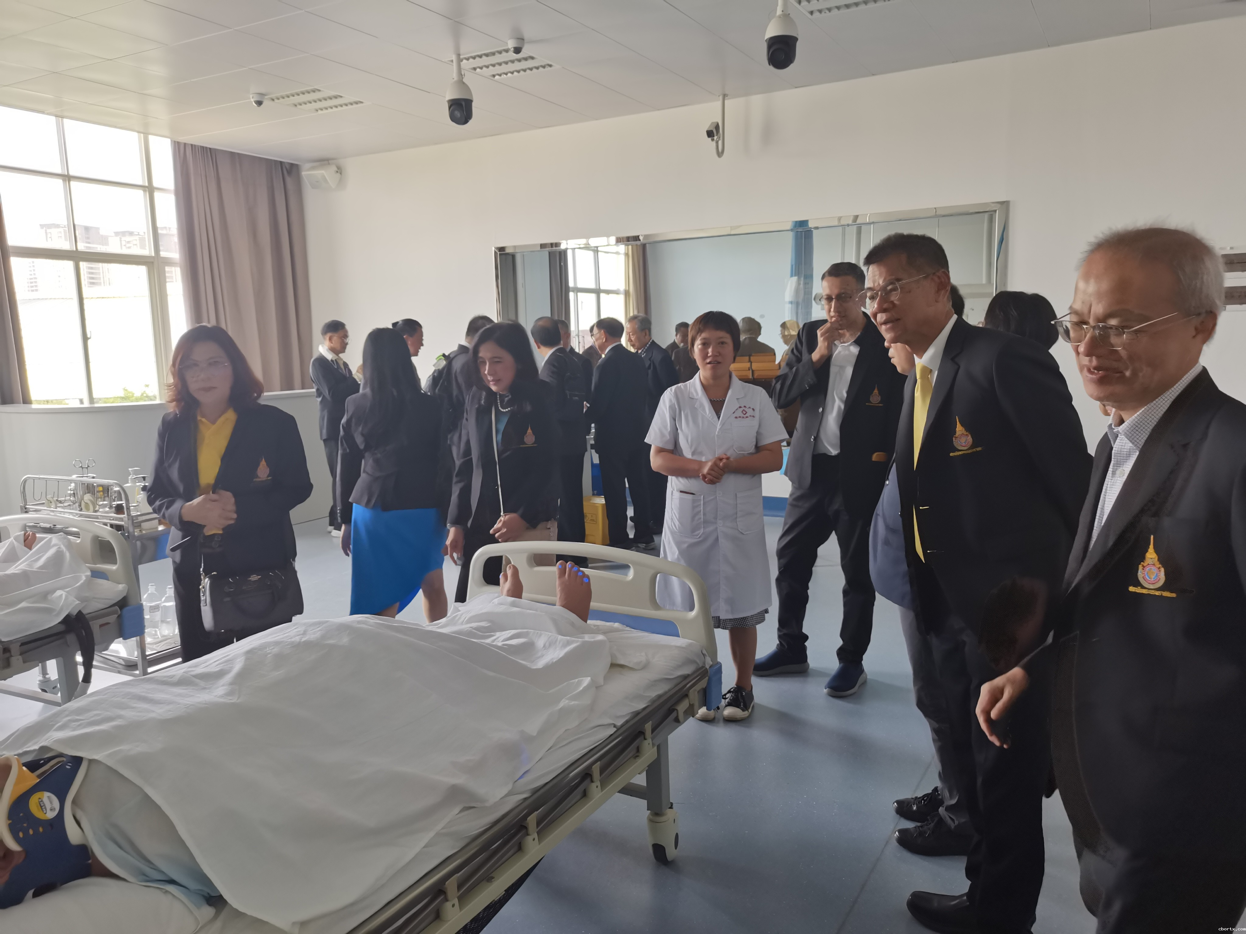 2024年6月3日,泰国巴拉马查诺克国王健康人才发展研究院院务管理委员会委员、副校长和有关学院领导一行至临床技能中心参观调研。