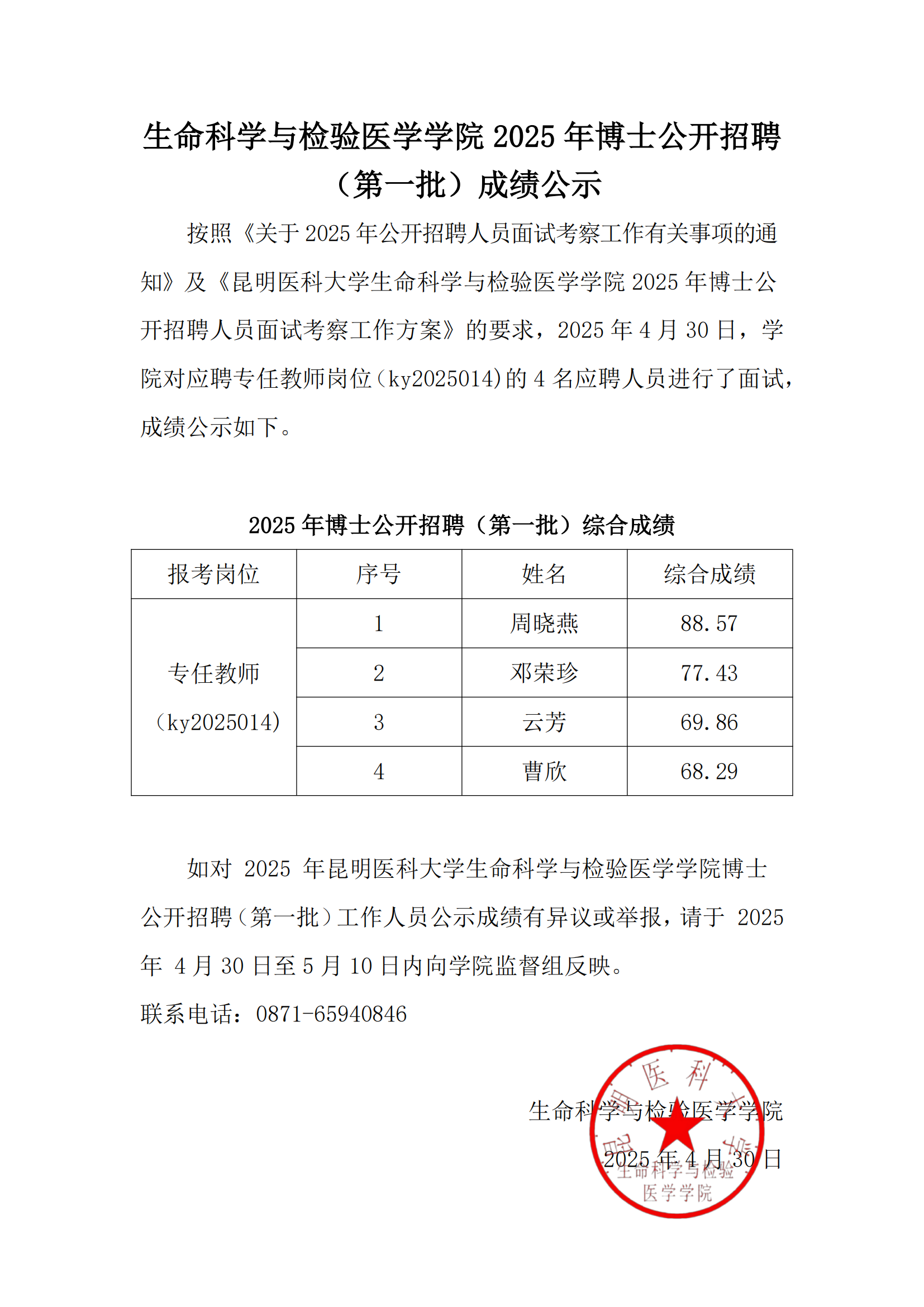 生命科学与检验医学学院2025年博士公开招聘(第一批)成绩公示