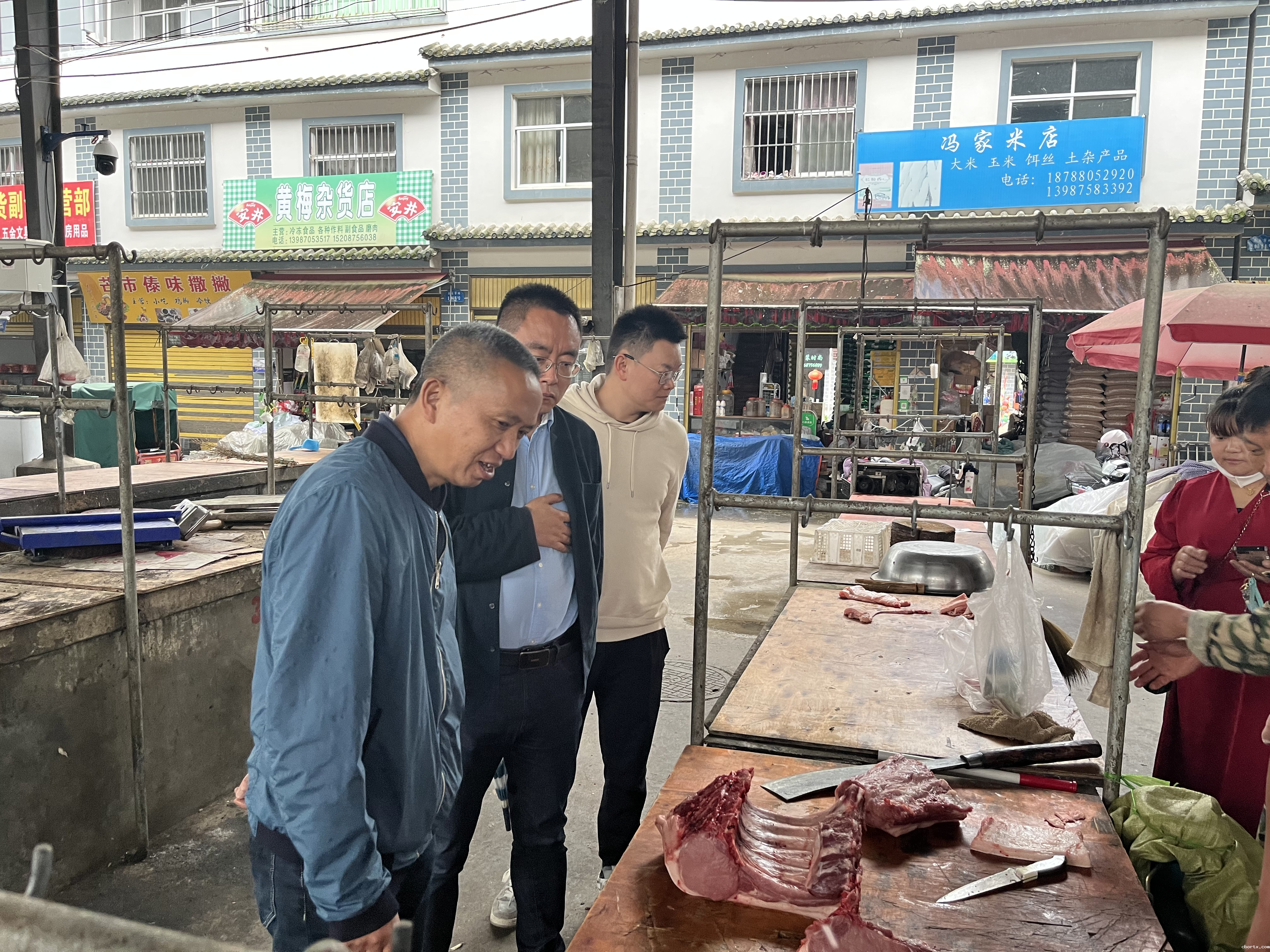 (图为学校驻村工作队员到农贸市场考察猪肉销售情况)