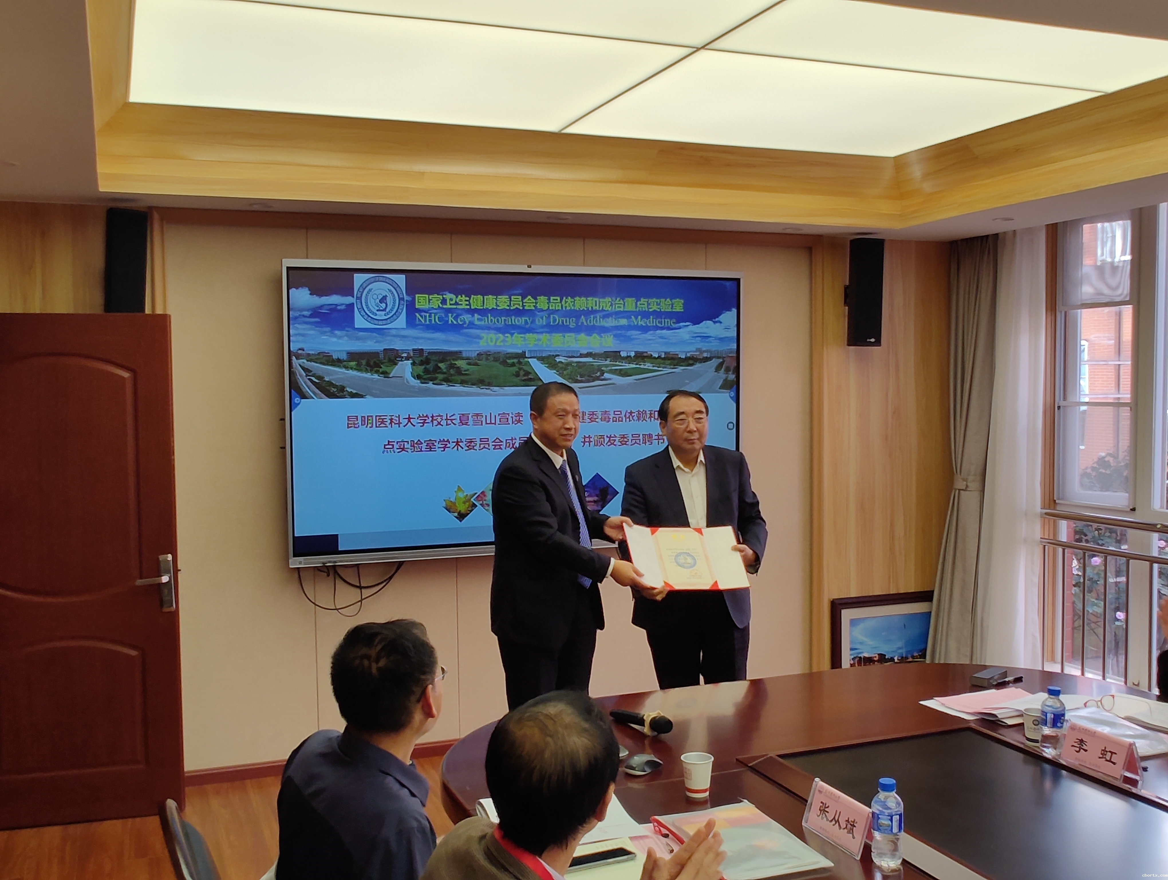 夏雪山指出毒品问题既关系到公共安全,也关系到人民生命健康。云南特殊的时空环境,导致毒品及毒品相关问题尤为突出,已成为制约云南高质量跨越式发展的因素之一。18luck备用登录在毒品依赖与戒治领域有一定的基础,并具有显著的区域特色,在此基础上2019年获批立项建设国家卫生健康委重点实验室。经过4年的建设,取得一定的成效,但也还有需要进一步提升的空间。此次召开由丛斌院士领衔的学术委员会会议,由衷希望各位委员对重点实验室的建设发展进行问诊把脉,指明方向,为把实验室建设成为特色明显,区域领先的国家部委实验室建言献策。夏雪山同时为各位委员颁发了聘书。