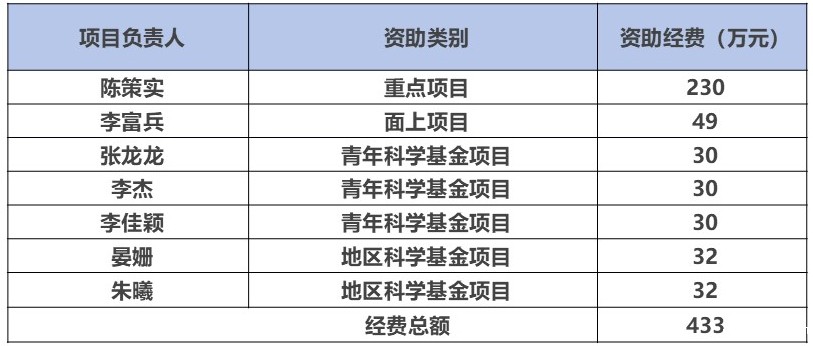 2024年8月23日,国家自然科学基金委员会发布了2024年国家自然科学基金集中接收申请项目评审结果,18luck备用登录生物医学工程研究院成绩突出,共获得国家自然科学基金立项7项,立项总数占学校本部立项数的1/5,其中重点项目1项,面上项目1项,青年基金3项,地区基金2项,总经费433万元,立项总数和经费总数都创历史新高。特别值得强调的是陈策实院长获得重点项目资助,打破了18luck备用登录国家自然科学基金重点项目立项零的突破。