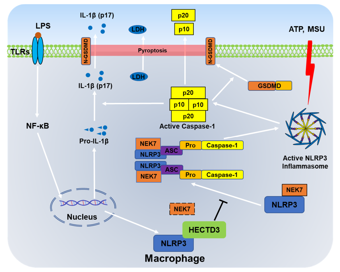 NLRP3是一种细胞内模式识别受体。NLRP3在感知内源和外源性的各种刺激后,其能够通过招募NEK7、ASC及pro-Caspase-1等蛋白从而组装成能够介导pro-Caspase-1酶原激活的复合物,该复合物即被称为NLRP3炎症小体。炎症小体组装能够促进Caspase-1的切割与活化,活化后的Caspase-1一方面能够介导促炎细胞因子IL-1β和IL-18的切割与成熟,另一方面还能够促进GSDMD切割以促进细胞焦亡,这两个过程共同导致炎症反应的发生。NLRP3炎症小体的激活需要预激活信号与激活信号两个信号步骤。预激活是由TLRs、NOD2和TNFR1/2等受体介导的NF-κB信号通路活化从而上调NLRP3和pro-IL-1β的转录及表达的过程;激活是由ATP、尿酸钠晶体、尼日利亚菌素等多种类型的内源或外源性物质介导NLRP3的构像改变从而促进NLRP3炎症小体的组装过程。由于NLRP3炎症小体的激活因子最为广泛,相关疾病类型众多,因此成为目前免疫学研究领域最为热门的靶点之一。