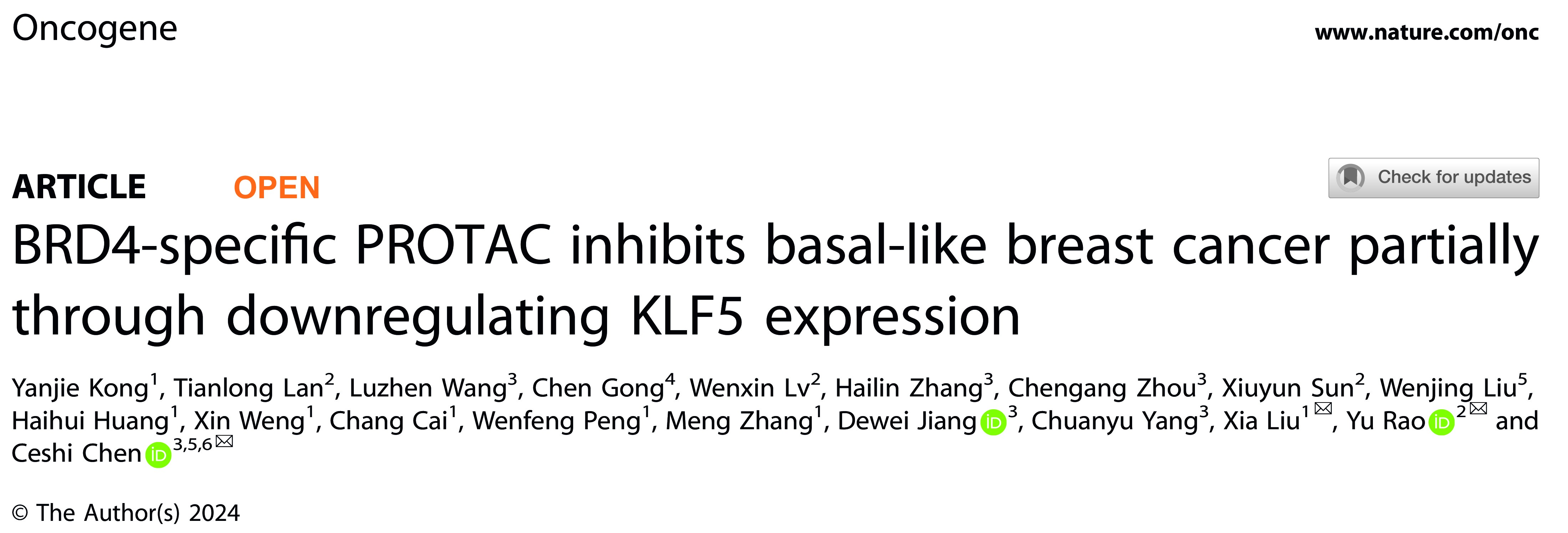 最近,18luck备用登录生物医学工程研究院、18luck备用登录第三附属医院陈策实院长团队与清华大学药学院饶燏教授团队合作,在国际癌症研究领域的《Oncogene》杂志发表题为“BRD4-speci?c PROTAC inhibits basal-like breast cancer partially through downregulating KLF5 expression”的研究论文。