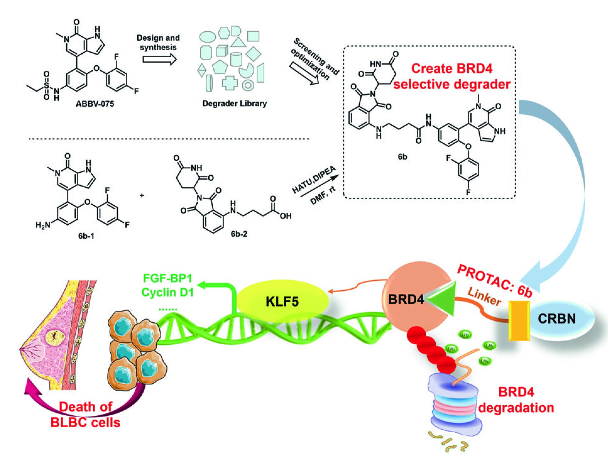 近年来,人们对利用蛋白降解靶向嵌合体(Proteolysis-targeting chimeras, PROTACs)技术在乳腺癌的治疗中呈现出较好的发展潜力,开发更为特异、高效的靶向乳腺癌的PROTAC,与现有临床药物联合应用可能是改善晚期乳腺癌不良预后的新策略。 其中,靶向雌激素受体ER的PROTAC药物ARV-471已经进入了治疗ER阳性晚期乳腺癌3期临床。组蛋白H3K27的乙酰化修饰是基因转录活化的典型特征,在超级增强子尤其显著富集,BRD4蛋白可以结合乙酰化H3K27,从而招募组装转录复合物启动基因转录表达,所以BRD4已经成为非常热门的抗癌药物靶点,多个BRD4小分子抑制剂如JQ-1,870和BRD4的 PROTAC化合物对肿瘤表现出很好的抑制作用。然而它们的成药性受到非特异性靶向其它BRD蛋白的限制。