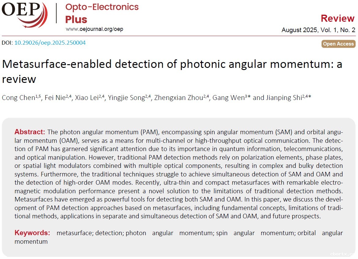 近日,18luck备用登录生物医学工程研究院文刚副研究员团队联合铜陵学院陈聪团队与安徽师范大学石建平教授团队,应邀在光学领域新刊《Opto-Electronics Plus》上发表题为“Metasurface-Enabled Detection of Photonic Angular Momentum: A Review”的创刊综述文章。该论文系统回顾了基于超表面的光子角动量(Photon Angular Momentum, PAM)检测技术的最新进展,总结了当前领域面临的关键挑战,并对未来研究方向作出展望。