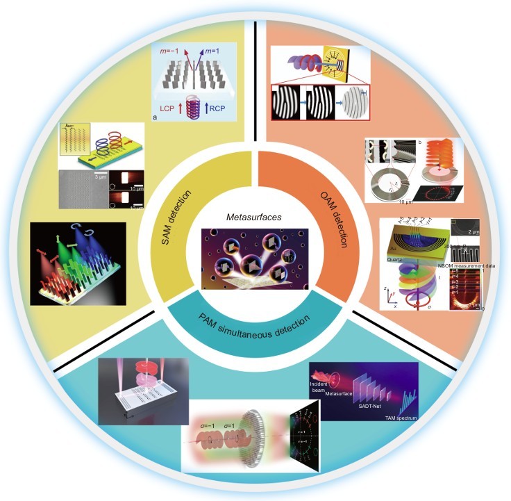 光子角动量(PAM)包括自旋角动量(SAM)和轨道角动量(OAM),分别对应光的偏振和波前相位分布。PAM可作为光通信、量子信息及高精度光学操控中的新信息维度,显著提升信道容量与系统安全性。然而,传统的SAM/OAM模式信息探测依赖波片、空间光调制器、相位片或复杂干涉光路,器件体积大、系统复杂且难以同时读取SAM与OAM,尤其对高阶OAM模式的识别能力有限。