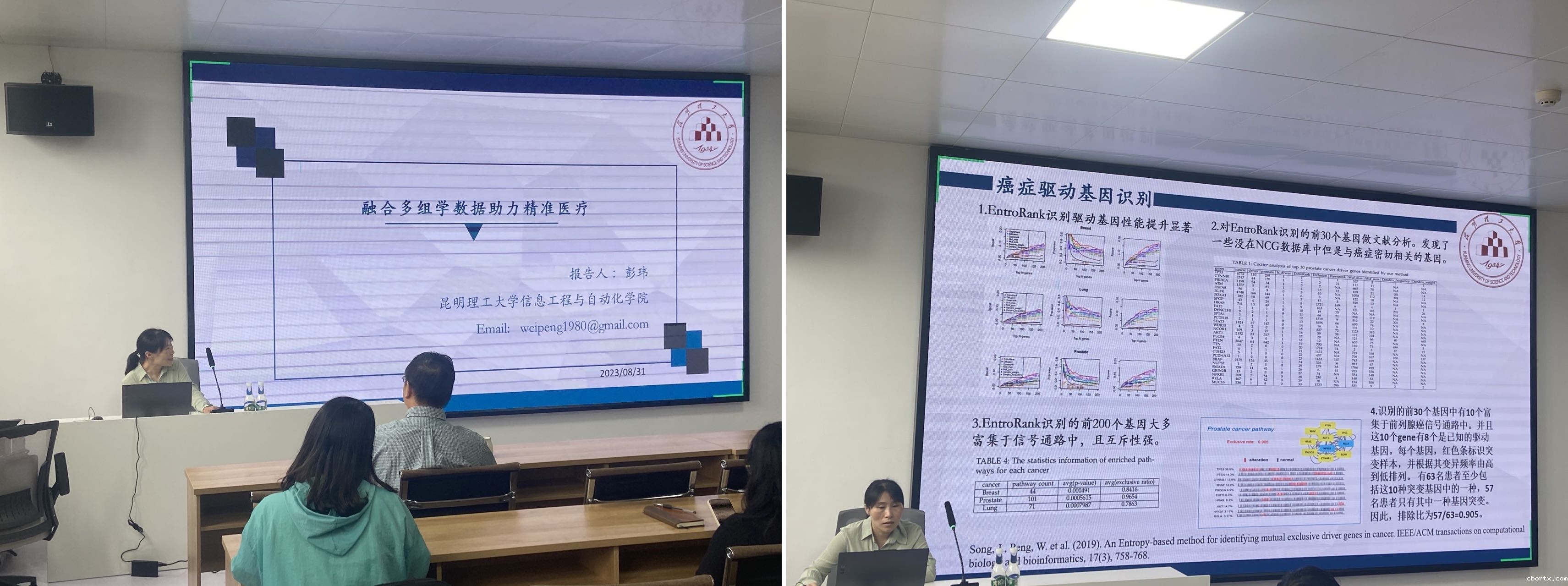 彭玮教授以“融合多组学数据助力精准医疗”为主题进行了学术报告,彭教授介绍到,癌症是复杂和异质性的疾病,随着测序技术的发展,大规模的癌症基因组研究工程公开了大量不同癌症、不同病人、不同组学的数据,这为研究癌症发病机制,从而为患者制定精准的治疗方案提供了数据基础。然而多组学数据的海量、异质、多源的特性,也给如何设计有效的计算方法来融合多组学数据,从系统层面理解生物分子的功能和相互作用、进而促进疾病机理研究提出了挑战。彭教授从跟癌症发生发展机制相关的生物特性出发,介绍了利用生物信息学技术,设计图论模型和人工智能算法来集成这些异质的多组学数据,在癌症驱动基因识别、癌症亚型划分、抗癌药物敏感性预测、处理和分析单细胞组学数据等方向上取得的进展。