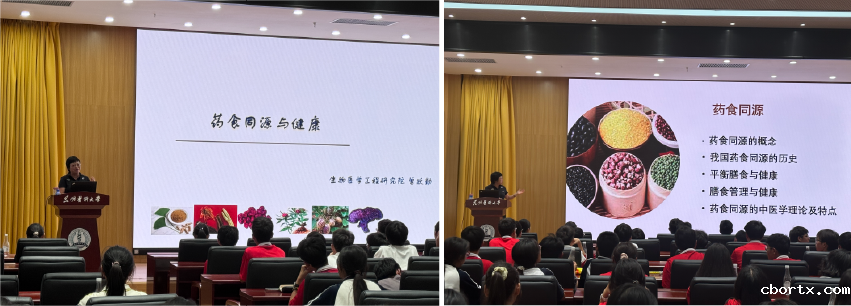 最后,师生们到图书馆4楼报告厅听取曾跃勤副教授开展的《药食同源与健康》学术讲座。曾教授从传统中医智慧出发,结合现代营养学知识,深入浅出地阐述了什么是药食同源,以及如何通过合理膳食促进健康。讲座内容丰富,生动有趣,赢得了师生们的热烈反响。