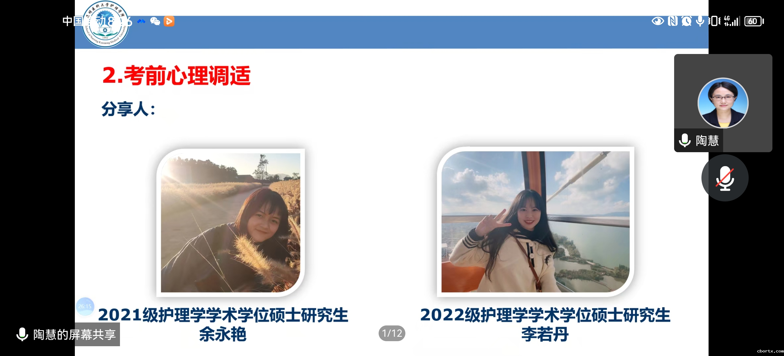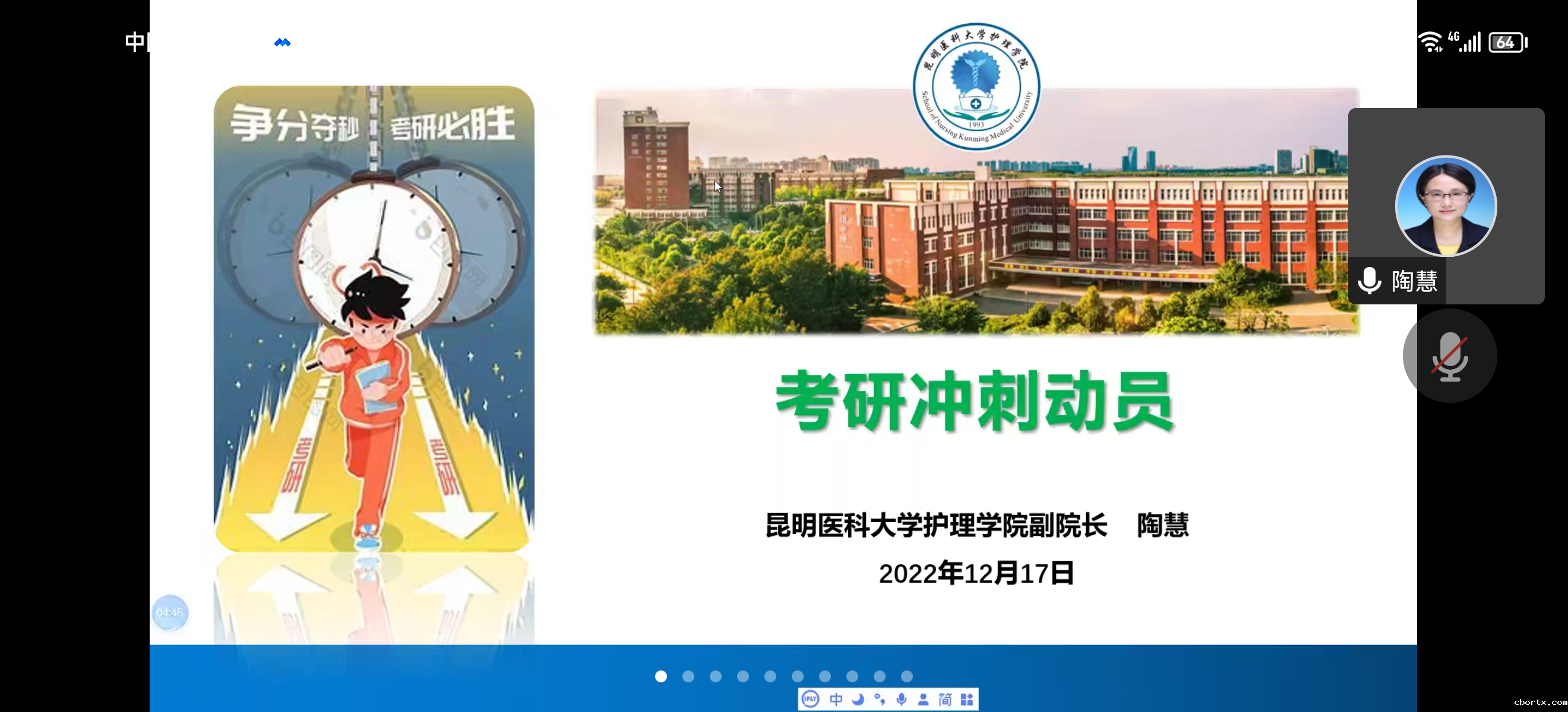 为进一步激发考研学生的拼搏精神,增强其迎考备战的信心,护理学院于12月18日晚以线上会议的方式召开2023届毕业生考研冲刺动员会,副院长陶慧、毕业班辅导员以及2023届考研学子参加会议。