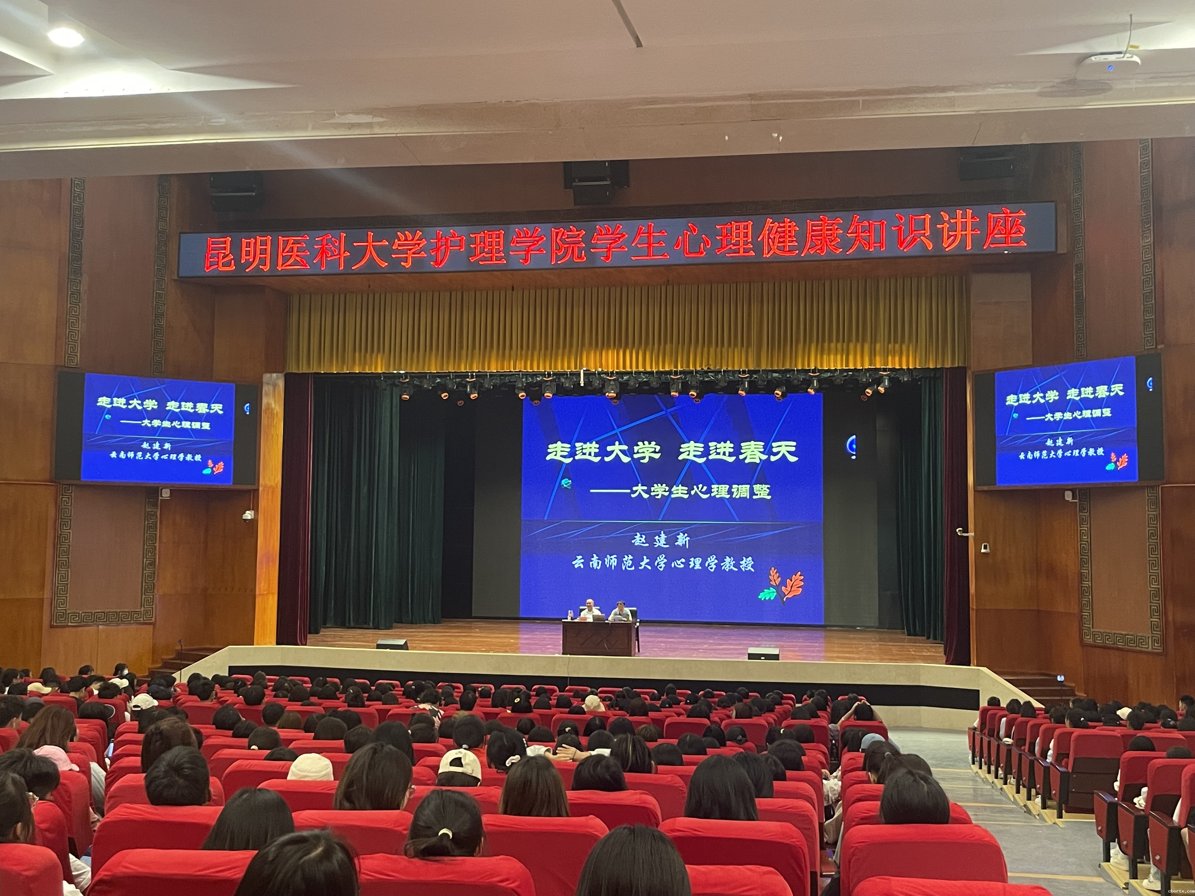 4月21日下午两点,18luck备用登录护理学院邀请到云南省著名心理学专家赵建新教授,在呈贡校区学生会堂开展了“走进大学,走进春天——大学生心理调整”主题心理讲座。讲座旨在普及心理健康知识,引导学生利用自身和他人力量调整心理压力,更理性、健康、负责地规划校园生活。讲座由护理学院党委副书记聂兆祥主持,全院辅导员和学生共1300余人参加。