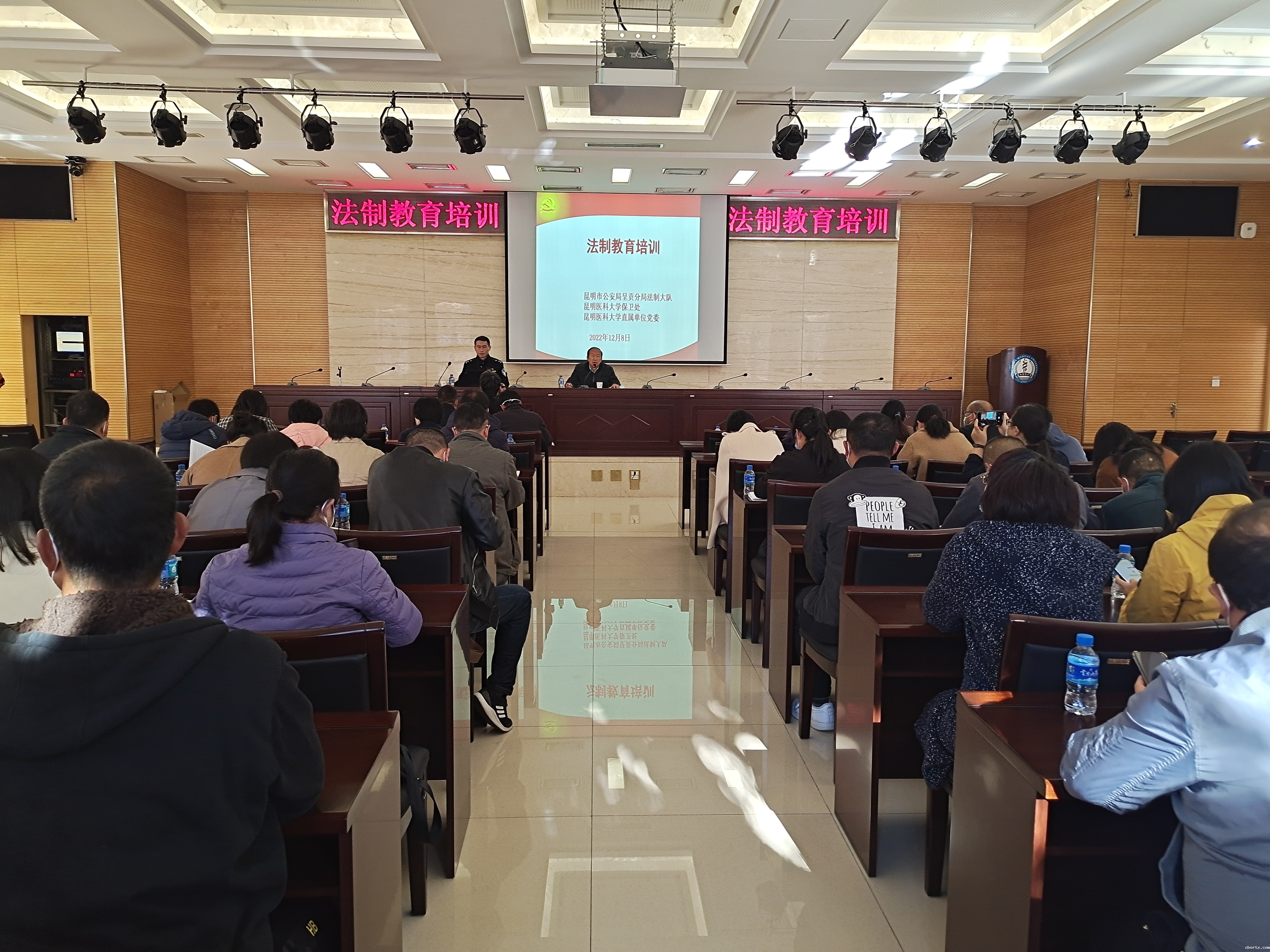 12月8日上午,直属单位党委、保卫处和昆明市公安局呈贡分局法制大队共同举办的“法律宣传进校园”活动在学术交流中心第二报告厅开展。邀请呈贡公安分局法制大队民警刘恒开展法治教育培训。直属单位科级干部和支委、保卫处全体人员共计60余人参加培训。培训由直属单位党委书记刘卫华主持。