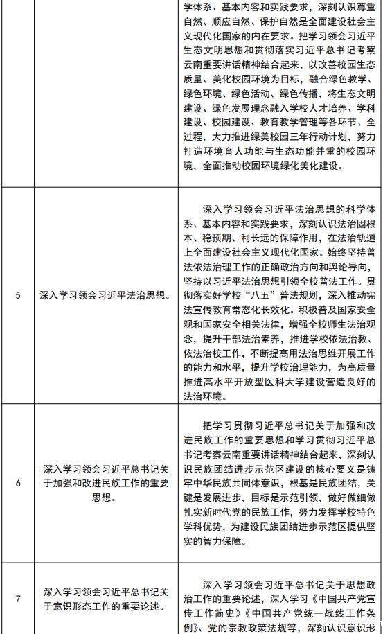 坚持不懈学习马克思列宁主义、毛泽东思想、邓小平理论、“三个代表”重要思想、科学发展观,把深入学习贯彻习近平新时代中国特色社会主义思想和党的二十大精神作为学习的主题主线,结合即将在全党开展的主题教育,着力在全面学习、全面把握、全面落实上下功夫,深刻认识习近平新时代中国特色社会主义思想实现了马克思主义中国化新的飞跃,深刻把握习近平新时代中国特色社会主义思想的世界观和方法论,深刻领悟“两个确立”的决定性意义,增强“四个意识”、坚定“四个自信”、做到“两个维护”,更加紧密地团结在以习近平同志为核心的党中央周围,自信自强、守正创新,踔厉奋发、勇毅前行,切实把学习成果转化为奋进新征程、建功新时代的工作实效,为努力建设高水平开放型医科大学不懈奋斗。