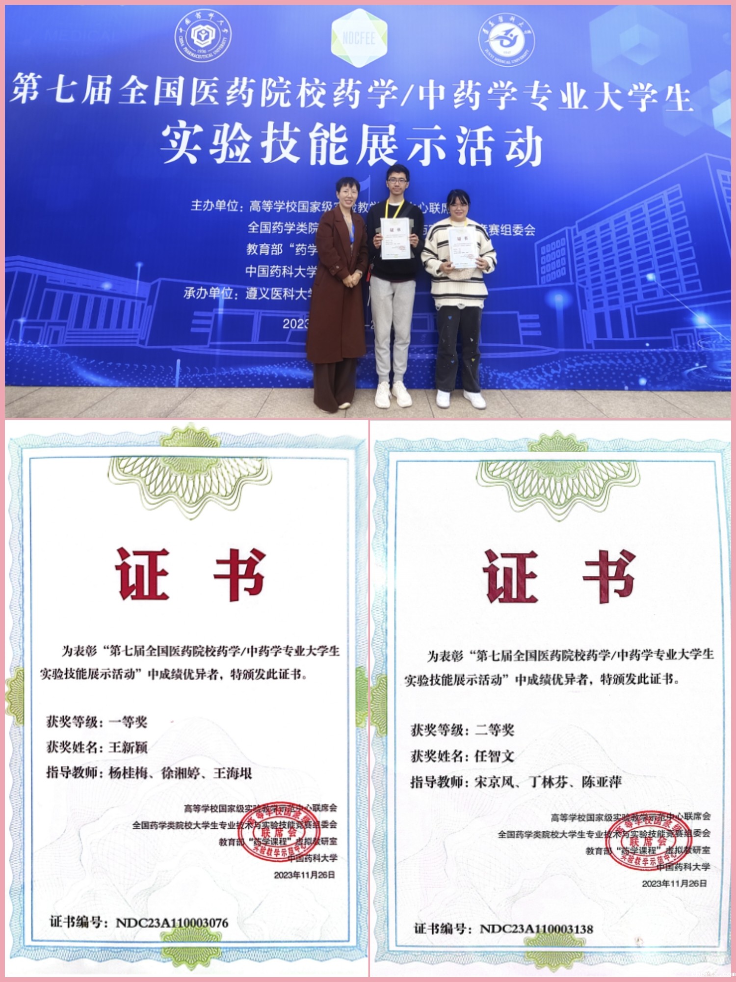 2023年11月24日-26日,由教育部高等学校药学类专业教学指导委员会、高等学校国家级实验教学示范中心联席会药学学科组主办的“第七届全国医药院校药学/中药学专业大学生实验技能展示活动”在遵义医科大学举行。来自北京大学、复旦大学、中国药科大学、海军军医大学等126所院校的250名学生参赛。药学院选派2021级药学专业2名本科生参加,王新颖荣获一等奖(指导教师:杨桂梅、徐湘婷、王海垠)、任智文同学荣获二等奖(指导教师:宋京风、丁林芬、陈亚萍)。