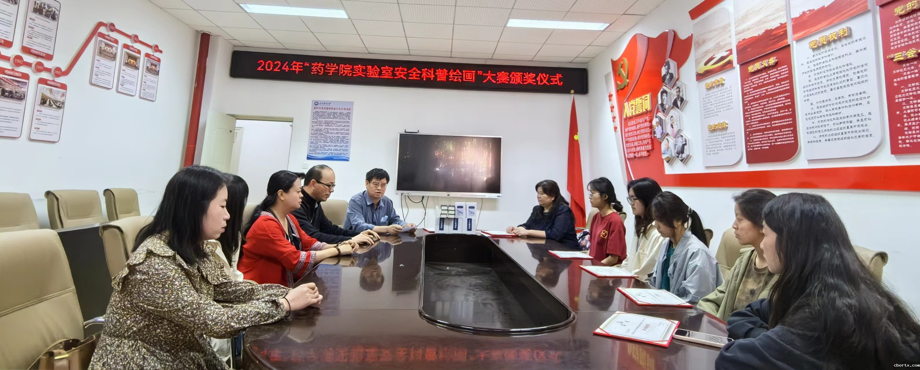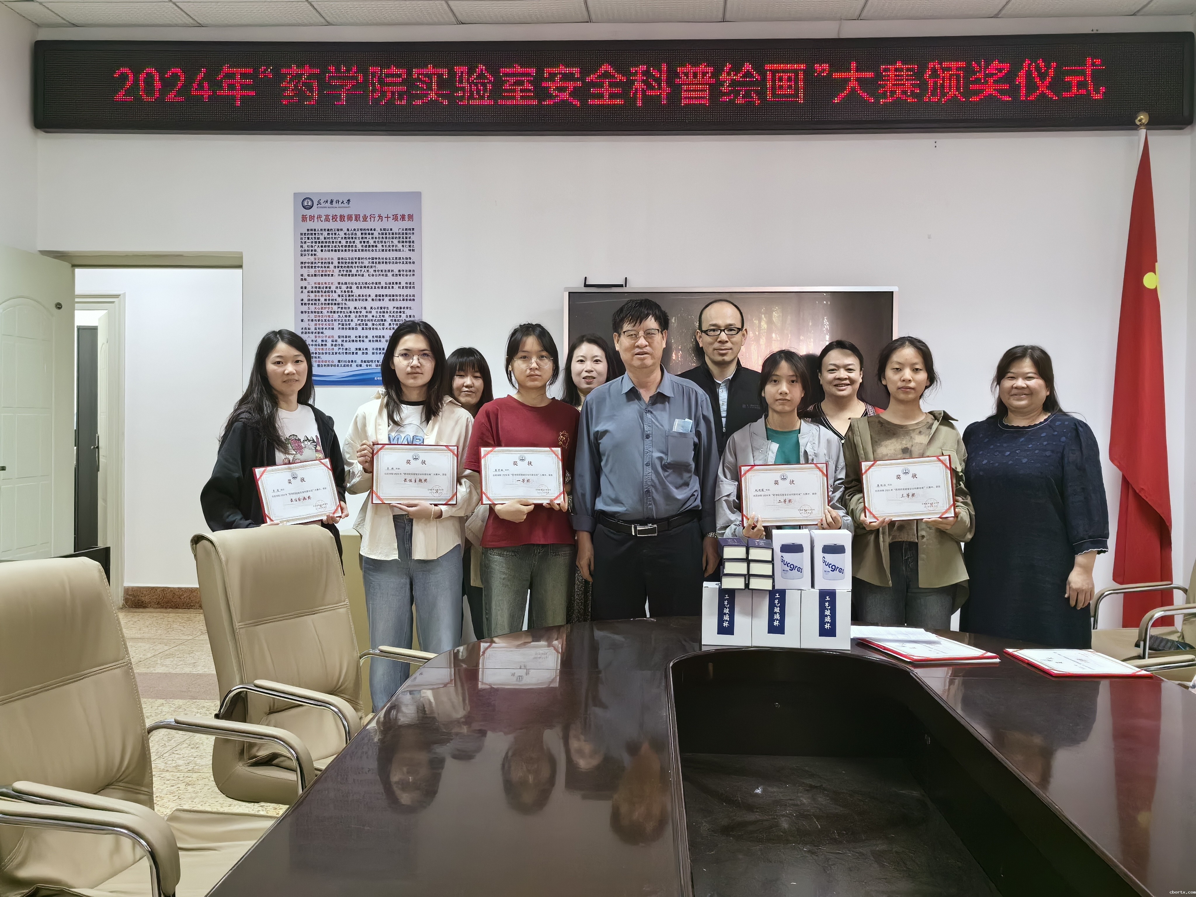2024年5月10日,由药学院教学实验中心主办的实验室安全科普绘画大赛圆满落幕,颁奖仪式在药学楼103会议室举行。药学院党委书记张有福、实验中心主任杨桂梅及部分师生代表出席颁奖仪式。