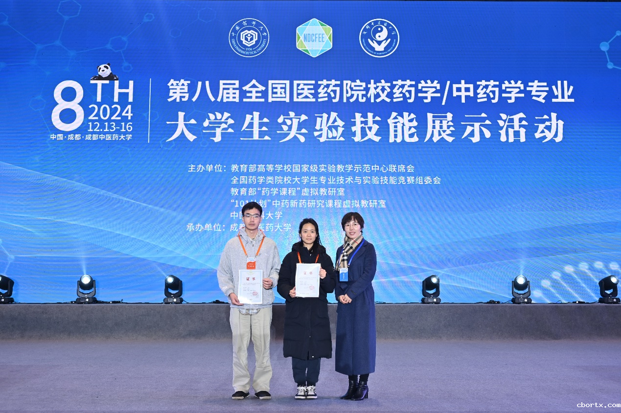 2024年12月14-15日,由教育部高等学校药学类专业教学指导委员会、高等学校国家级实验教学示范中心联席会药学学科组主办的“第八届全国医药院校药学/中药学专业大学生实验技能竞赛”在成都中医药大学如期举行。来自北京大学、复旦大学、中国药科大学、海军军医大学等148所医药院校的288名学生代表参加了本次竞赛。我院选拔的两名同学2022级临床药学专业赵栩宁(指导老师:徐湘婷、王海垠、孙孔春)和2022药学专业包毓凡(指导老师:丁林芬、杨璨瑜、陈亚萍)分别获得二等奖和三等奖。