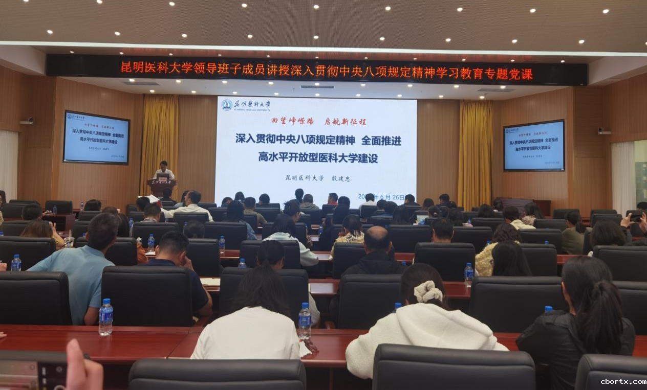 殷建忠副校长以《深入贯彻中央八项规定精神,全面推进高水平开放型医科大学建设》为题,围绕“百年潮起师生共读史”和“立德树人启航新征程”两个部分展开讲述。在第一部分“百年潮起师生共读史”时,殷建忠深入回顾了党的百年奋斗历程,讲述了中国党史上的重大事件,并结合医药行业在不同历史时期的发展和贡献,激励师生们传承和弘扬先辈们的精神。在第二部分“立德树人启航新征程”中,他着重强调了高校在新时代的使命和责任。他指出,培养具有高尚医德、精湛医术的医药人才是学院教育的核心任务。他鼓励师生们树立远大理想,将个人的成长与国家医药事业的发展紧密结合起来,在新的征程中勇于担当、积极作为。