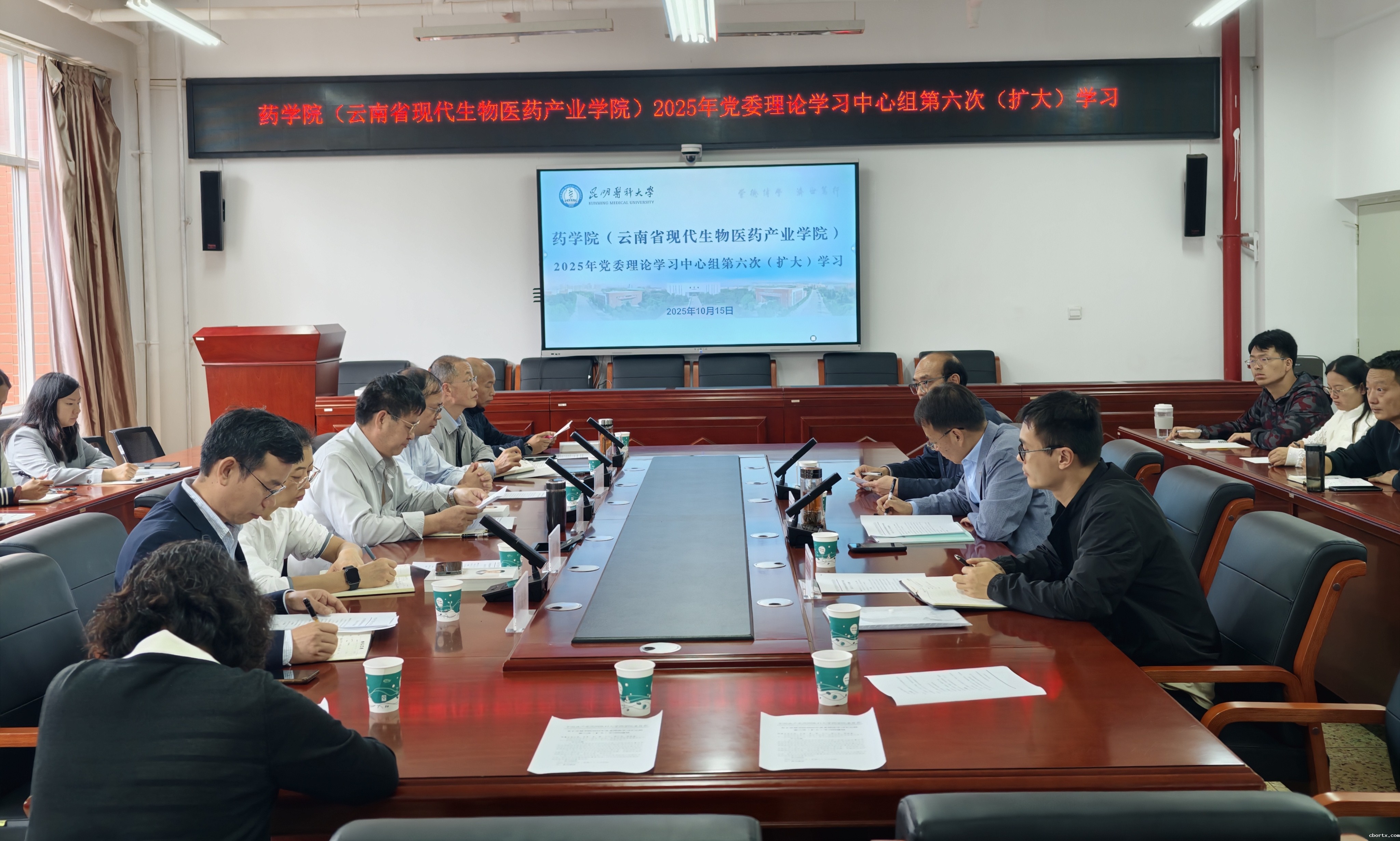 2025年10月15日,药学院党委理论学习中心组2025年第六次(扩大)学习在药学楼二楼会议室举行。学校党委常委、副校长殷建忠列席指导,基础医学院党委委员、副院长韩毅,基础医学院党委专职组织员李超列席会议,学院党委委员、非党院领导、中层干部参加学习。会议由药学院党委书记张有福主持。