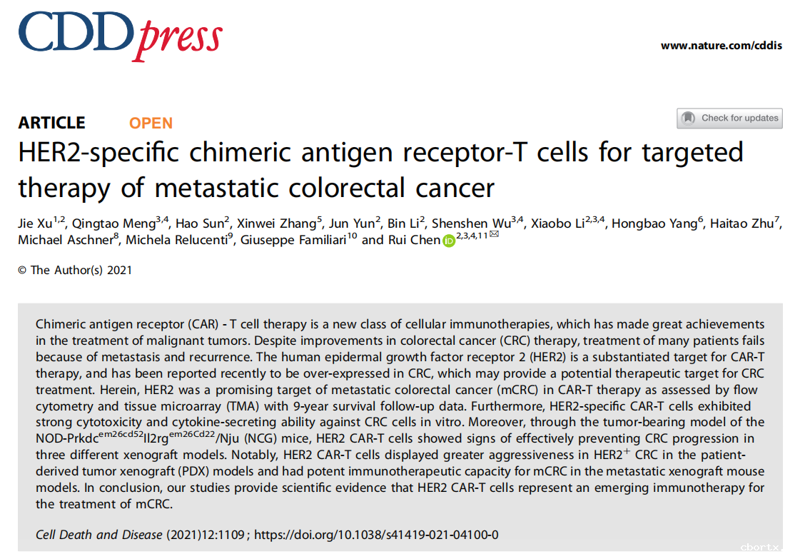 综上所述,该研究鉴于以往的经验和未来的可能性,大胆探索将CAR-T疗法引入实体瘤治疗。该研究是第一个通过一系列严格的体内/外实验证实HER2 CAR-T是转移性结直肠癌的一种新兴的免疫治疗方法,为此类患者的康复提供了一种新的治疗策略。