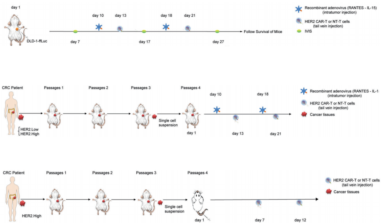 图1HER2 CAR-T细胞疗法用于治疗结直肠癌的三种动物模型