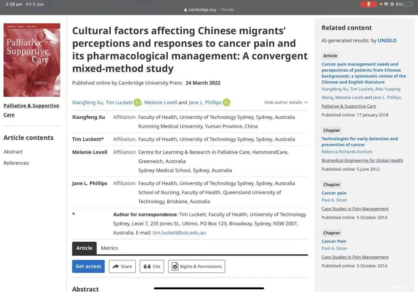 研究报道,70%的癌症患者由于生活质量长期受到癌性疼痛的影响,会出现一系列生理、心理和社会性问题。导致癌症患者的疼痛难以控制的主要原因包括癌症患者没有及时地向医护人员报告疼痛、对止痛药使用的依从性差;而文化差异可能会加剧这些问题的发生。2022年3月,18luck备用登录护理学院的徐湘凤博士及其澳大利亚的导师团队(昆士兰科技大学的Phillips博士、悉尼科技大学的Luckett博士和悉尼大学的Lovell教授)在Palliative Supportive Care上发表题为Cultural factors affecting Chinese migrants’ perceptions and responses to cancer pain and its pharmacological management: A convergent mixed-method study的最新研究成果。