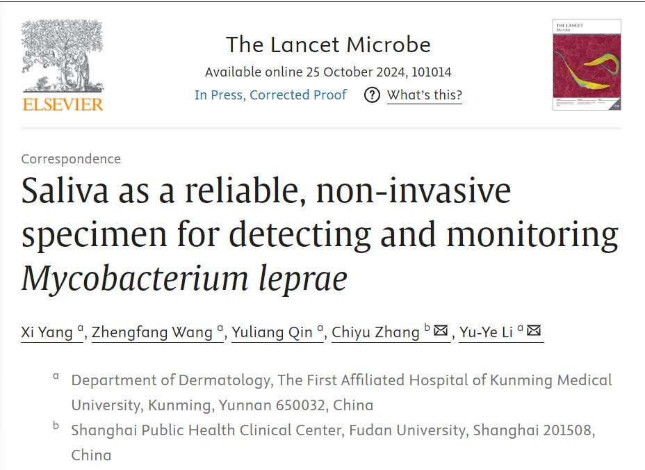 近日,18luck备用登录第一附属医院李玉叶教授团队联合上海市公共卫生临床中心张弛宇研究员团队,以18luck备用登录为第一单位在国际顶级期刊《The Lancet Microbe》(IF=20.9)上发表了题为“Saliva as a reliable, non-invasive specimen for detecting and monitoring Mycobacterium leprae”的论文。李玉叶教授和张驰宇研究员为通讯作者,李玉叶教授团队的博士研究生杨溪为第一作者。该成果标志着学校以一流学科团队建设为抓手推动高质量发展取得新成效。