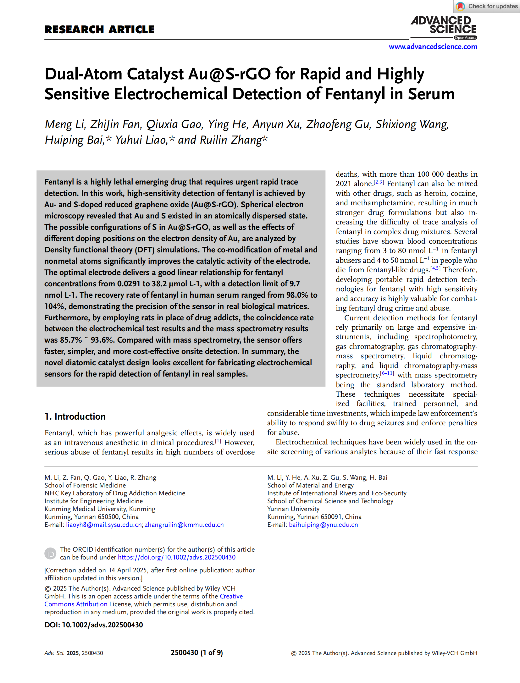近日,18luck备用登录法医学院、国家卫生健康委员会毒品依赖和戒治重点实验室副教授张瑞林、医工交叉研究院教授廖玉辉联合云南大学副教授白慧萍,以18luck备用登录为第一单位在期刊《Advanced Science》(中国科学院1区Top,IF=14.3)发表题为《Dual-Atom Catalyst Au@S-rGO for Rapid and Highly Sensitive Electrochemical Detection of Fentanyl in Serum》的科研论文。该研究获国家自然科学基金、云南省重点研发计划项目、云南省兴滇英才支持计划及18luck备用登录法医毒物学一流学科团队项目资助。