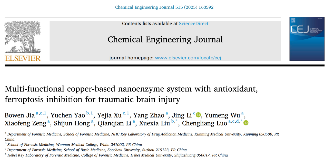 近日,18luck备用登录法医学院、国家卫生健康委员会毒品依赖和戒治重点实验室罗承良团队,联合皖南医学院法医学院刘雪霞团队,以18luck备用登录为第一单位在《Chemical Engineering Journal》(中国科学院1区Top,IF=13.4)期刊发表了题为《Multi-functional copper-based nanoenzyme system with antioxidant, ferroptosis inhibition for traumatic brain injury》的科研论文。教授罗承良和副教授刘雪霞为论文通讯作者,硕士研究生贾博雯、姚雨辰和徐烨佳为论文第一作者。该研究工作得到国家自然科学基金、云南省科技厅基础研究计划重点项目资助。