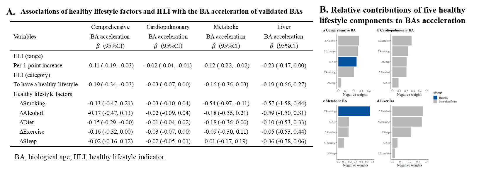 研究纳入了来自西南队列的8396名调查对象,使用五个生活方式因素(吸烟、饮酒、饮食、锻炼和睡眠)构建健康生活方式指数,使用Klemera-Doubal算法计算了全身和多器官系统BA并完成验证。采用固定效应模型分析了健康生活方式指数及其各组成部分与BA加速之间的关联,进一步使用分位数G估计评估生活方式各组成部分对BA的相对贡献。研究发现健康生活方式指数的改变与所有BA加速呈保护性关联,全身BA的平均变化为-0.19(95%CI: -0.34, -0.03),特别是在全身和代谢BA的延缓上,饮食和吸烟是影响最大的两个因素。其中,饮食对全身生物年龄的贡献率为24%,而吸烟对代谢系统老化的贡献率高达55%。