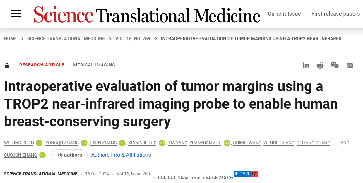 近日,18luck备用登录第三附属医院张国君教授作为唯一通讯作者在Science子刊《Science Translational Medicine》(影响因子15.8分)发表了题为Intraoperative evaluation of tumor margins using a TROP2 near infrared imaging probe to enable human breast-conserving surgery的研究论文。张国君教授团队的博士研究生陈伟玲、硕士研究生张莉欣、汕头大学医学院附属肿瘤医院张永渠教授为论文的共同第一作者。该研究成果标志着学校在组织实施科技工作高质量内涵式发展方面取得了重要进展。