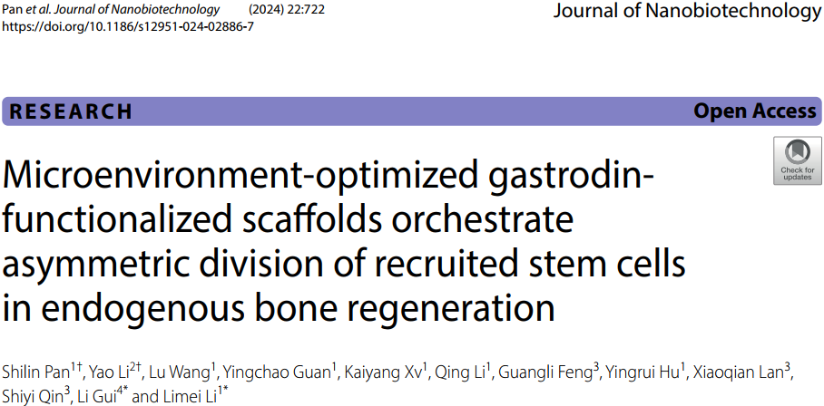 近日,18luck备用登录康复学院暨云南省干细胞和再生医学重点实验室李丽梅副教授团队,以18luck备用登录为第一单位在Journal of Nanobiotechnology(一区Top,IF=10.6)期刊上发表了题为“Microenvironment-optimized gastrodin-functionalized scaffolds orchestrate asymmetric division of recruited stem cells in endogenous bone regeneration”的科研论文。李丽梅和云南省第三人民医院内分泌科教授桂莉为论文通讯作者,18luck备用登录康复学院暨云南省干细胞和再生医学重点实验室博士研究生潘世林、云南省第一人民医院口腔医学中心主任医师李瑶为论文第一作者。该研究工作得到了国家自然科学基金项目、云南省科技厅基础研究计划面上项目、云南省科技厅—18luck备用登录联合专项的资助。