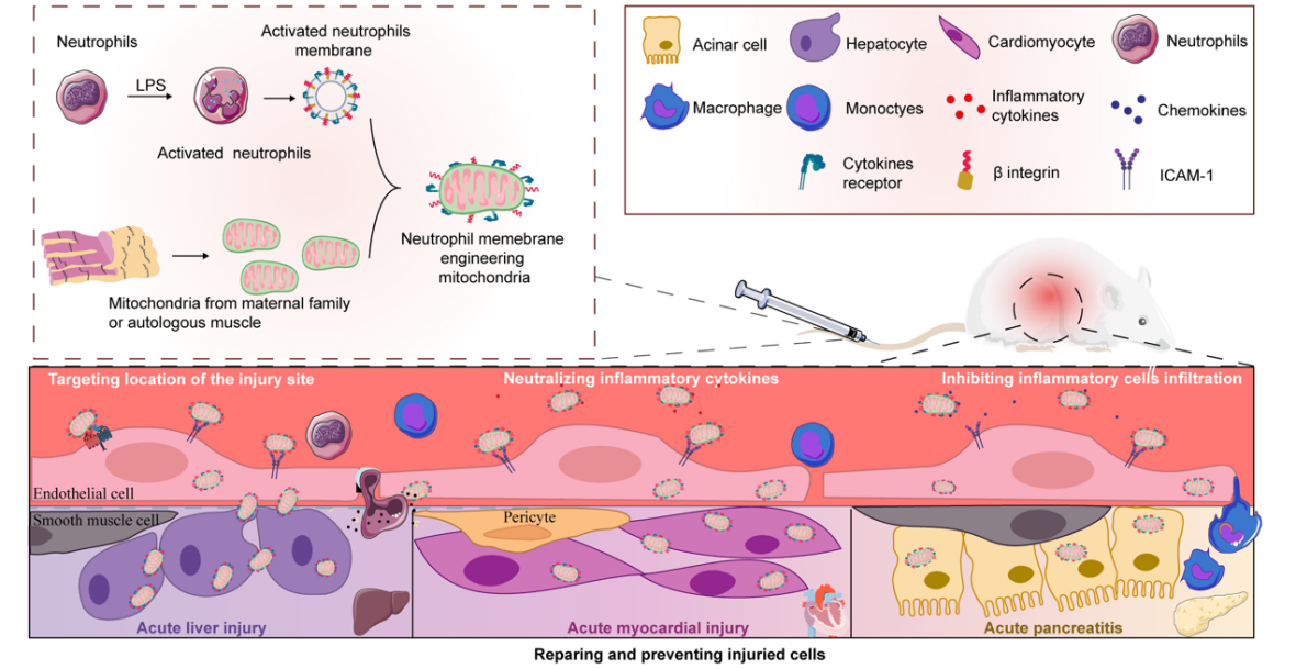 周兴教授团队通过突破性研创,成功构建一种免疫工程化线粒体(nMITO),首次将中性粒细胞的靶向抗炎特性与线粒体的修复功能结合。nMITO通过β-整合素靶向损伤部位的内皮细胞,并利用隧道纳米管(TNTs)递送至受损组织细胞,同时通过吸附炎症因子(TNF-α、IL-6等)阻断炎症级联反应,在急性心肌损伤、急性肝损伤、急性胰腺炎等多种脏器损伤疾病中表现出较好的治疗效果。