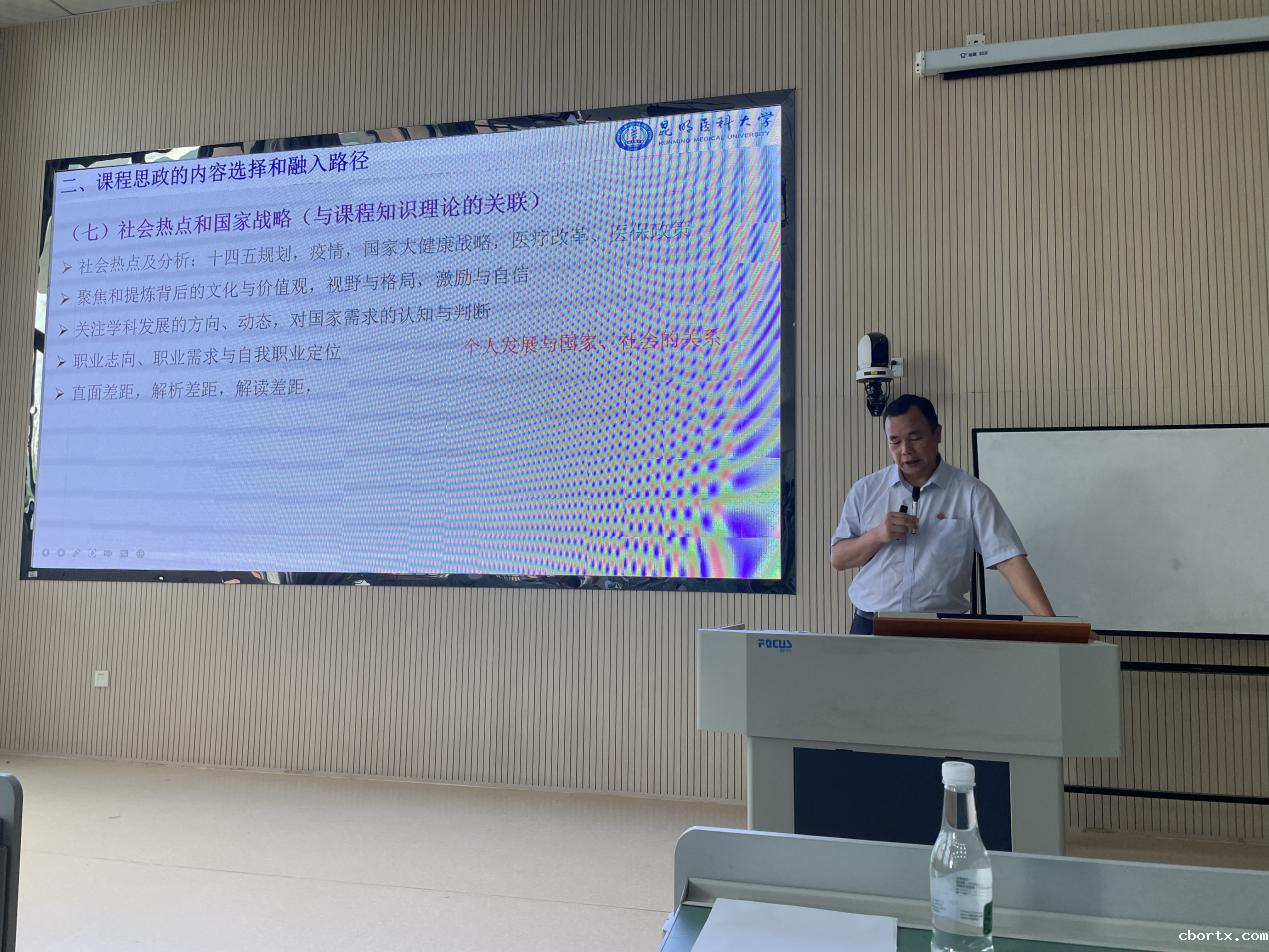 邹智荣首先对医学类专业课程思政建设的探索与实践做经验交流,并对前期学院“课程思政”教学项目和课程的申报情况进行了通报。邹智荣强调,高校教师应认真学习国家课程思政相关文件,真正学懂、弄通、坐实。要将课程思政落到实处,必须提升教师个人的思想道德修养和业务水平,真正做到为党育人、为国育才,落实好立德树人的根本任务。