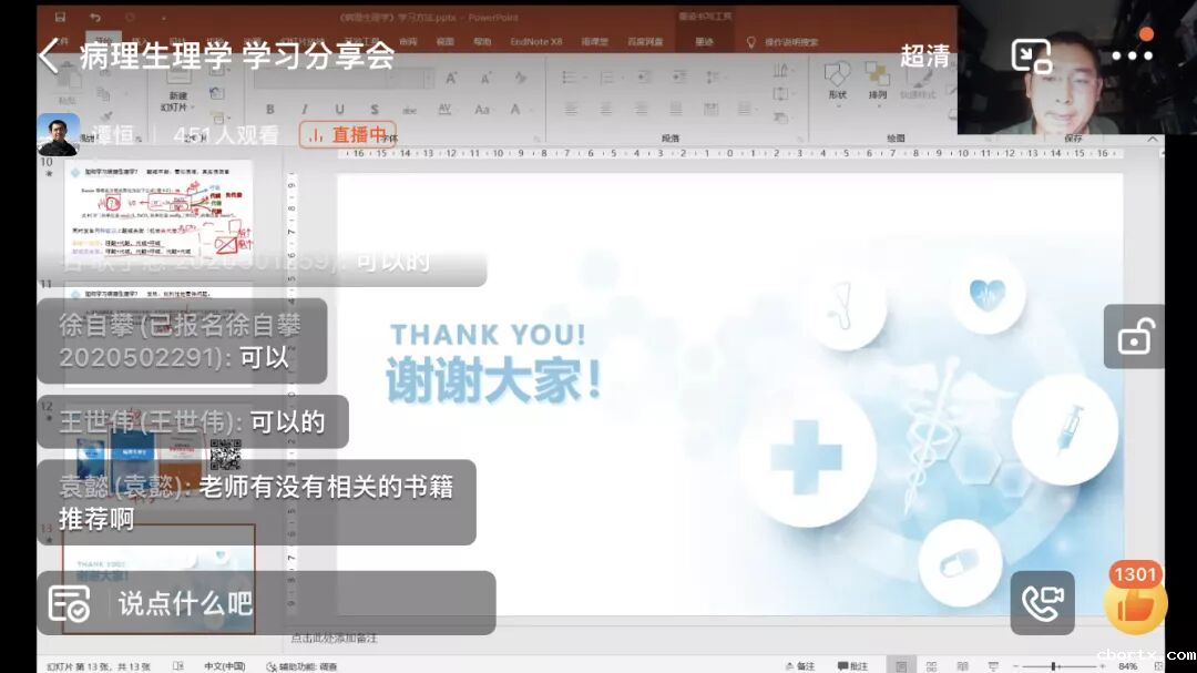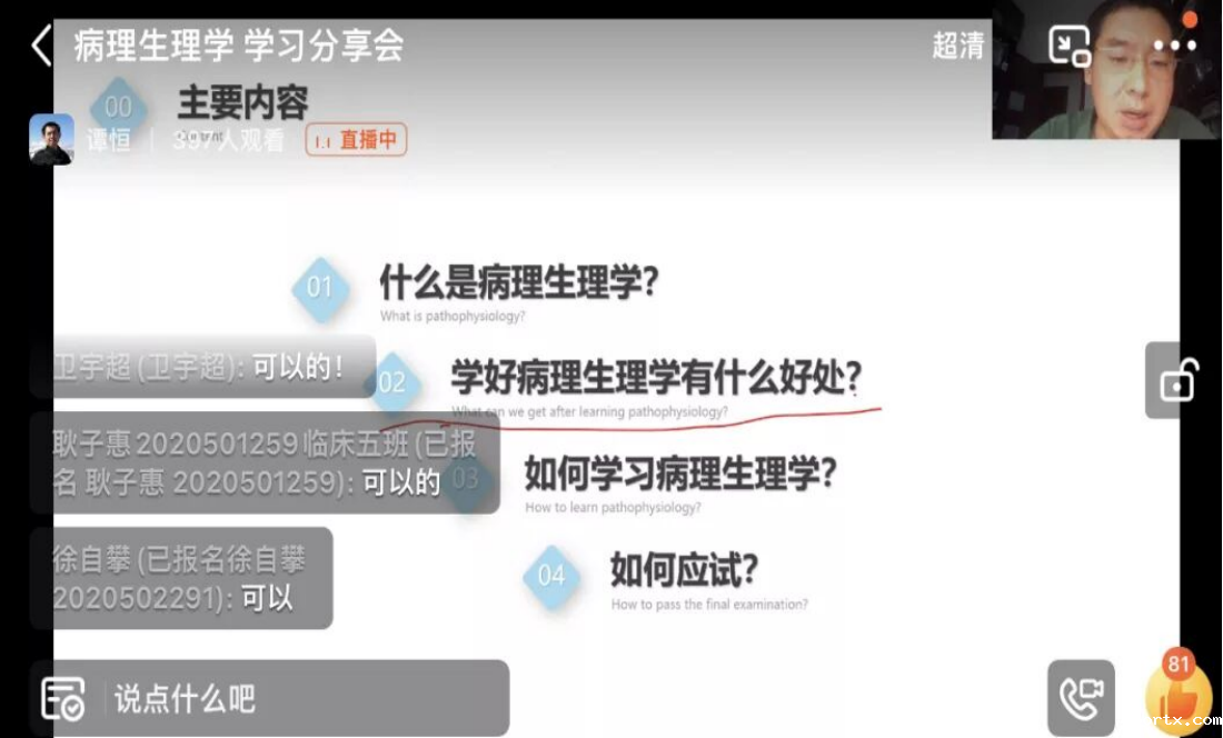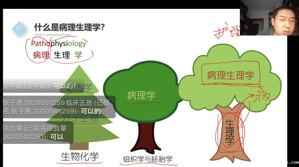 为深化“我为青年做件事”主题实践活动,着力解决同学们的实际问题,2022年9月29日18:30,基础医学院教学办和基础医学院学生会联合举办的病理生理学线上直播讲座顺利开展。此次讲座有幸邀请到了我院病理学与病理生理学系谭恒老师讲解,2020级500余名同学观看了直播。