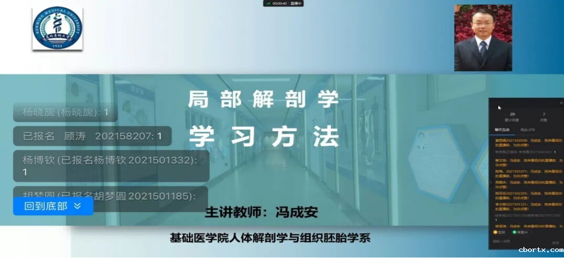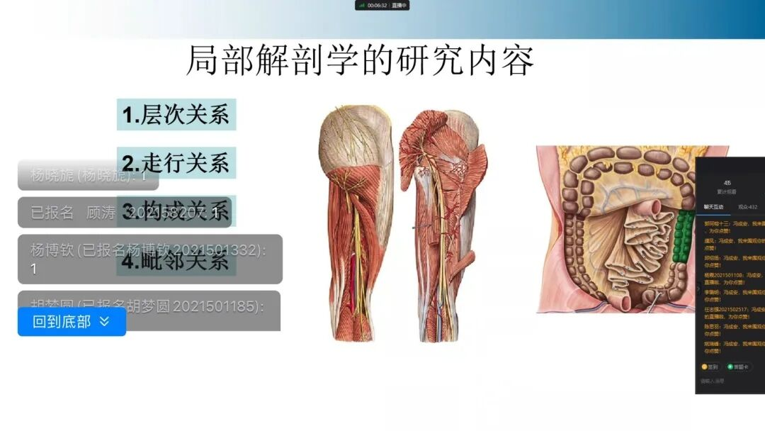 2022年9月27日下午六点半,基础医学院教学办和基础医学院学生会联合举办的局部解剖学讲座采用线上直播的形式开展,旨在帮助同学们掌握科学高效的局部解剖学学习方法。此次讲座有幸邀请到了我院人体解剖学与组织胚胎学系冯成安教授和2020级徐茜同学讲解,2021级500余名同学观看了直播。