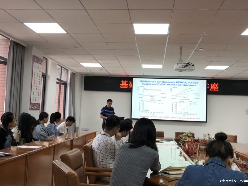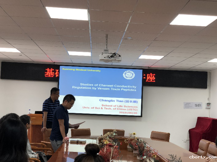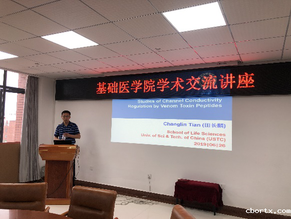 此次学术报告在基础医药大楼621室举行,田长麟教授围绕“Studies of Channel Conductivity Regulation by VenomToxin Peptide”这一主题,给在场的师生讲解了毒素多肽在药物研发中的关键性基础地位,同时介绍了其实验室在国际上高难度、高复杂性多肽合成技术的领先地位,此外,田长麟教授还介绍了利用高活性毒素多肽解析离子通道结构的最新进展以及在此基础上进行的药物改造、设计工作。这一系列工作引起了在场师生的浓厚兴趣,大家进行了热烈的现场讨论。