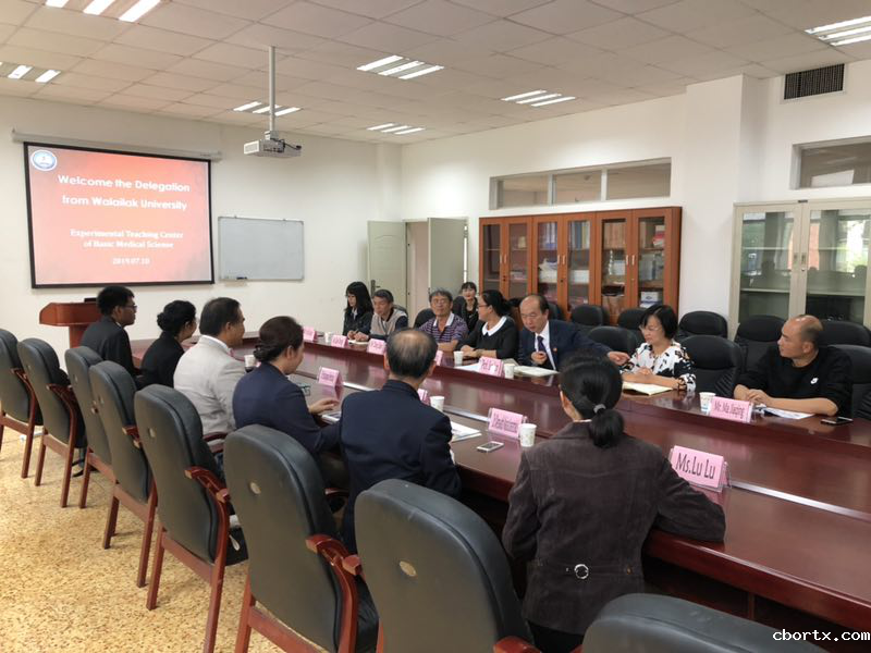 7月10日,泰国瓦莱岚大学代表团一行两人,分别为医学院院长Dr. Pratchayaphan Petchchuay和应用健康学院院长Assoc. Prof. Dr. Jitbanjong Tangpong,到基础医学院参加交流活动。基础医学院院长孙俊、党委副书记彭文彬、教学督导阮永华、各部门教师代表及实验教学中心相关人员参与相关活动。