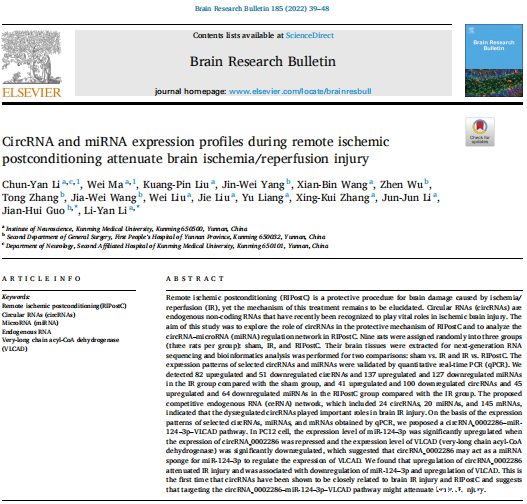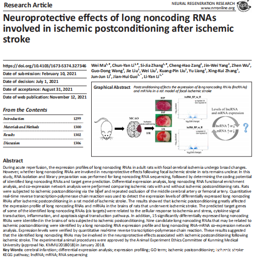 相关研究结果于近日发表于Neural Regeneration Research(中科院二区期刊),Effect of ischemic postconditioning on the expression profiles of long non-coding RNA and mRNA in rats with focal ischemic stroke. Neural Regeneration Research, 2022, 17(6):1299-1309. doi: 10.4103/1673-5374.327346和Brain Research Bulletin 2022(中科院三区期刊),CircRNA and miRNA expression profiles during remote ischemic postconditioning attenuate brain ischemia/reperfusion injury. Brain Res Bull. 2022 Apr 19:S0361-9230(22)00098-3. doi: 10.1016/j.brainresbull.2022.04.006.