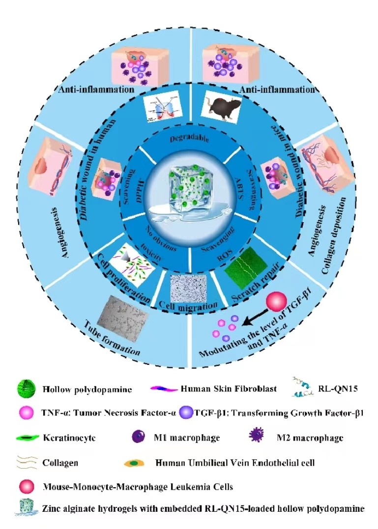 在本研究工作中,基础医学院杨新旺博士团队牵头,联合陕西师范大学材料科学与工程学院邓字巍教授团队、云南民族大学民族医药学院王滢教授团队、18luck备用登录第一附属医院皮肤科何黎教授团队和云南大学附属医院内分泌科杨莹教授团队,在国际著名期刊Materials and Design(中科院一区TOP,IF 2021=9.417)上在线发表文章(题目:Zinc alginate hydrogels with embedded RL-QN15 peptide-loaded hollow polydopamine nanoparticles for diabetic wound healing therapy;文章链接:https://www.sciencedirect.com/science/article/pii/S0264127522007079):通过空腔聚多巴胺(HPDA)负载多肽RL-QN15,嵌入由锌离子交联海藻酸钠形成的水凝胶中,成功制备了一种基于活性肽RL-QN15的复合凝胶HPDAlR&ZA。该凝胶不但对角质形成细胞(HaCaT)、人脐静脉内皮细胞(HUVEC)、人皮肤成纤维细胞(HSF)和小鼠没有显示出明显的毒性,而且能够显著促进HaCaT,HUVEC和HSF增殖以及HUVEC迁移和血管生成。此外,该凝胶还能够调节巨噬细胞相关的细胞因子表达。糖尿病小鼠全层皮肤创伤和糖尿病患者体外皮肤创伤模型表明该凝胶通过促进M1巨噬细胞到M2巨噬细胞的快速极化来抵抗炎症反应,从而重建血液供应,增加并加速糖尿病伤口修复和皮肤再生。我们的结果表明HPDAlR&ZA是治疗慢性伤口的一种有前景的创面敷料。本研究和课题组之前在ACS AMI发表的研究论文(PMID:35731847)共同证明了“海藻酸锌水凝胶+纳米材料+促修复肽”是有潜力的促慢性难愈合性皮肤创面愈合干预策略。
