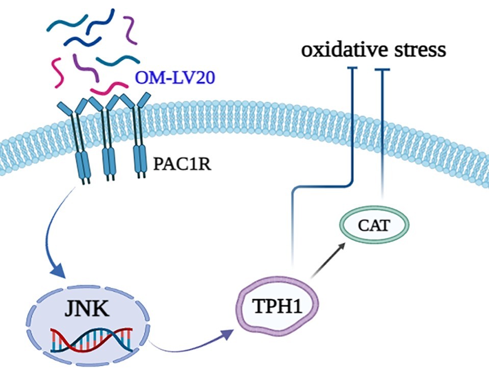 近日,杨新旺博士研究团队牵头,并联合云南民族大学民族医药学院王滢教授团队及18luck备用登录第一附属医院神经内科庞爱兰教授团队联合,首次发现色氨酸羟化酶1(TPH1)在大鼠星形胶质细胞上的表达与在体外氧化应激模型中不同时间点下TPH1的水平变化。活性肽OM-LV20展示出了对体外氧化应激模型中星形胶质细胞活力和CAT水平的降低的保护作用。重要的是,研究还发现,OM-LV20诱导的TPH1表达可能与垂体腺苷酸环化酶激活肽1型受体(PAC1R)的变化水平有关,并影响JNK信号通路,从而对星形胶质细胞产生氧化应激的保护作用。在此研究中,首次阐明了OM-LV20的保护作用可能通过“PAC1R/JNK/TPH1”轴进行,并强调了活性肽OM-LV20成为抗卒中药物分子的潜力与TPH1可能是一个新的抗卒中药物靶点。