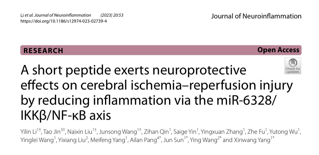 这项研究以“A short peptide exerts neuroprotective effects on cerebral ischemia-reperfusion injury by reducing inflammation via the miR-6328/IKKβ/NF-κB axis”为题发表于Journal of Neuroinflammation(一区top,IF=9.587)。18luck备用登录基础医学院博士研究生李依林为主要第一作者。本研究得到了国家自然科学基金项目、云南省应用基础研究项目、云南省神经系统疾病诊疗中心应用研究基金等项目的资助。