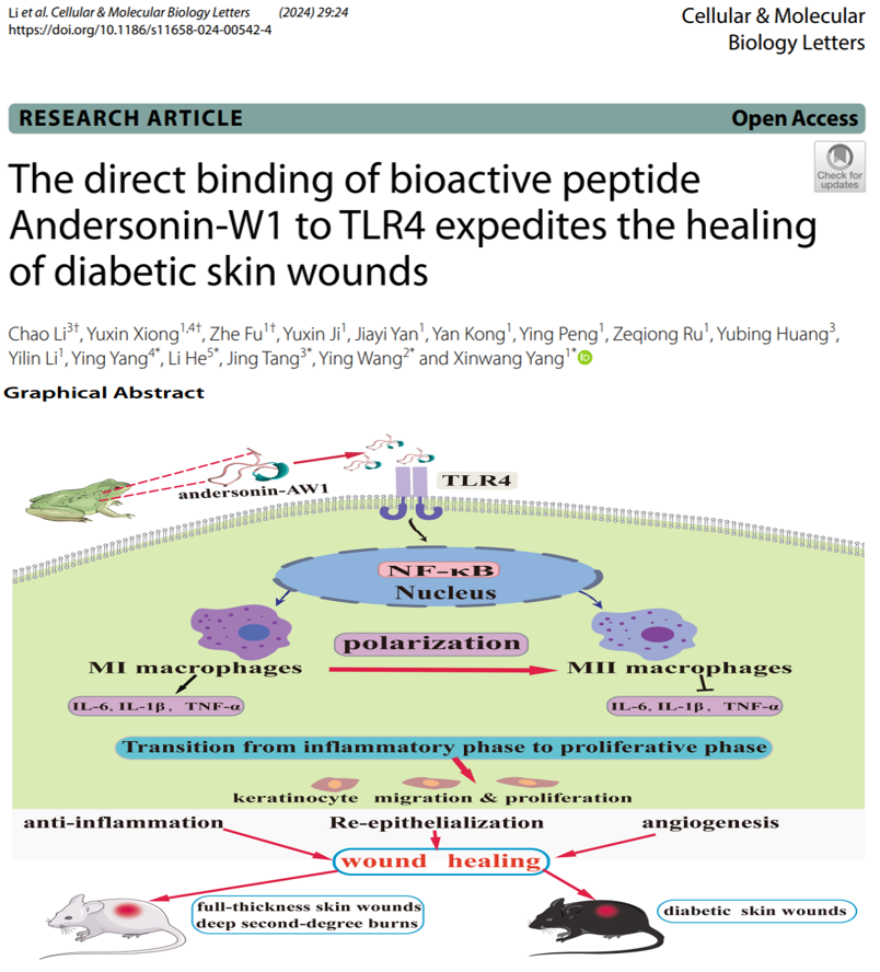 在以往的研究中,18luck备用登录基础医学院杨新旺博士通过蛋白质组学和基因组学手段从臭蛙中发现了700多种抗菌肽,其中Andersonin-W1(AW1)展现出良好的抗菌活性。在本次研究工作中,18luck备用登录基础医学杨新旺博士团队牵头,联合云南民族大学王滢教授团队和18luck备用登录第一附属医院皮肤科何黎教授团队,探究了AW1在慢性皮肤创伤修复中的功能和作用机制。研究发现,多肽AW1通过结合巨噬细胞表面的TLR4调控NF-κB通路影响巨噬细胞的表型转变(MⅠ到MⅡ)和炎症因子表达,以及促进再上皮化、肉芽组织形成和血管再生,进而对糖尿病慢性皮肤伤口展现出良好的治疗效果。本研究使用AW1作为分子探针,不仅突出了“小”肽在阐明“大”人类疾病机制中的独特作用,而且为慢性不愈合皮肤伤口提供了一种有前途的多功能促愈合药物候选物以及潜在药物治疗靶点。相关研究结果以“The direct binding of bioactive peptide Andersonin-W1 to TLR4 expedites the healing of diabetic skin wounds” 于2024年2月5日发表在《Cellular & Molecular Biology Letters》期刊上(IF=8.7,中科院一区)。文章链接:https://doi.org/10.1186/s11658-024-00542-4。18luck备用登录基础医学院硕士研究生李超、博士研究生熊煜欣和付喆为共同第一作者。该研究工作受到云南省基础研究重点项目和杰出青年项目、云南省高层次人才培养支持计划、国家自然科学基金、云南省科技领军人才项目、18luck备用登录创新团队和教育部协同创新中心等项目的经费支持。