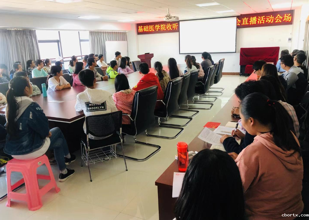 基础医学院党委要求各学生党支部,以及部分教师代表在基础医学院医药大楼614会议室集中收听收看,其中64位本科生代表、2位研究生代表、10余位教职工代表到现场进行收听收看,并在观看结束后参与了讨论。