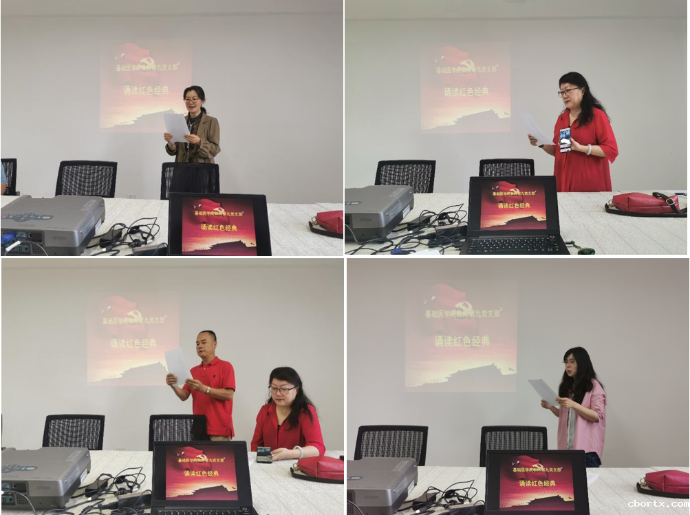 7月13日上午,基础医学院教师第九党支部结合党史学习教育开展“诵读红色经典”主题党日活动。党员同志通过朗诵的艺术形式,以近代红色经典诗文、爱国篇目为主题,深情朗诵了《我的祖国》《囚歌》《党旗颂》《祖国危难时,竭我一滴力》等篇目,一首首脍炙人口的革命诗歌,印记着红色史迹,蕴含着革命先烈们舍生取义的崇高气节和报国为民的炙热情怀。活动旨在进一步激发教师党员爱党、爱国、爱社会主义的深厚情怀,展示了支部教师积极向上的精神面貌。