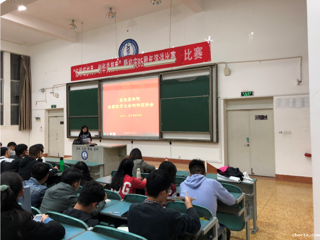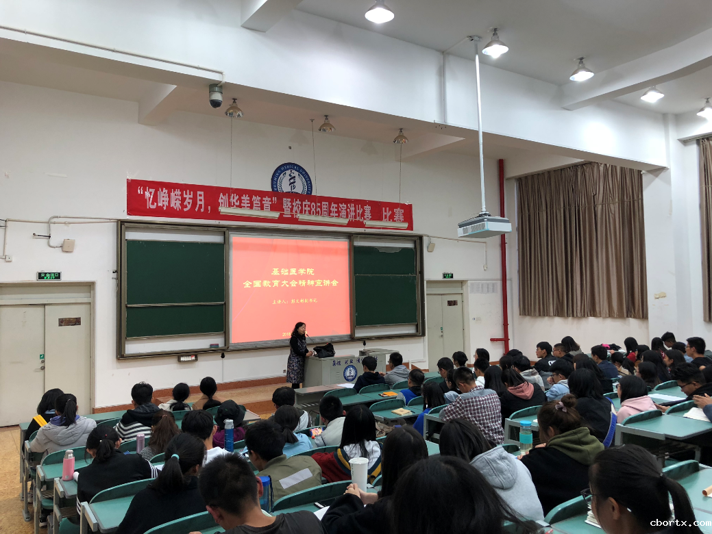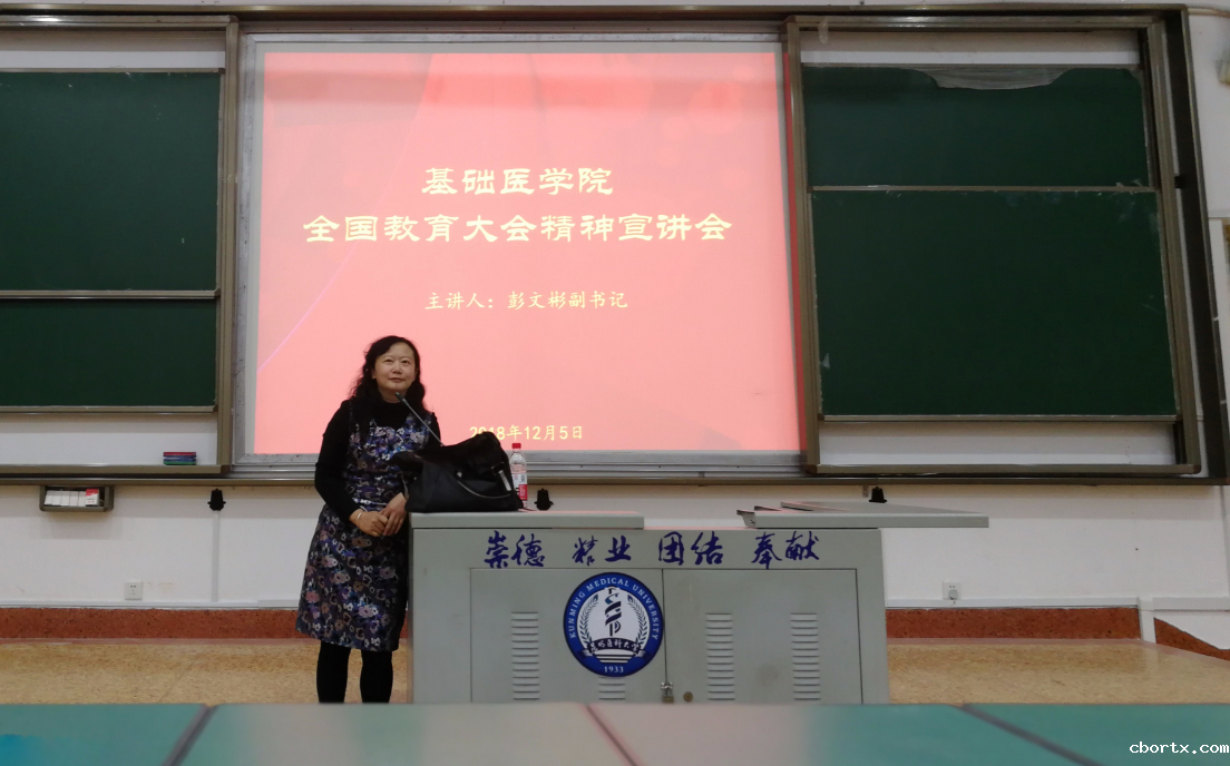 为贯彻落实全国教育大会精神,深入学习习近平重要讲话,2018年12月5日下午18:30,18luck备用登录基础医学院于教学楼6104开展了《全国教育大会精神宣讲》讲座,本次讲座由学院党委副书记彭文彬老师作为主讲人,2016、2017、2018级全体班级班长、团支书到场。